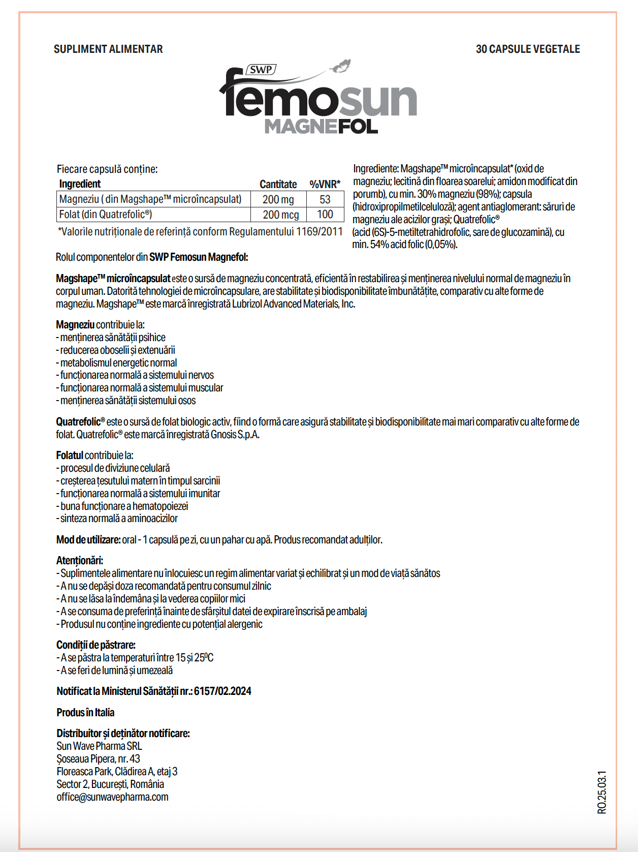 Magshape microincapsulat (oxid de magneziu, lecitina din floarea soarelui, amidon modificat din porumb, cumul 30% magneziu (98%)), capsula (hidroxipropilmetilceluloza), agent antiaglomerant: saruri de magneziu ale acizilor grasi, Quatrefolic® (acid (6S)-5-metiltetrahidrofolic, sare de glucozamina), cu min. 54% acid folic (0,05%).