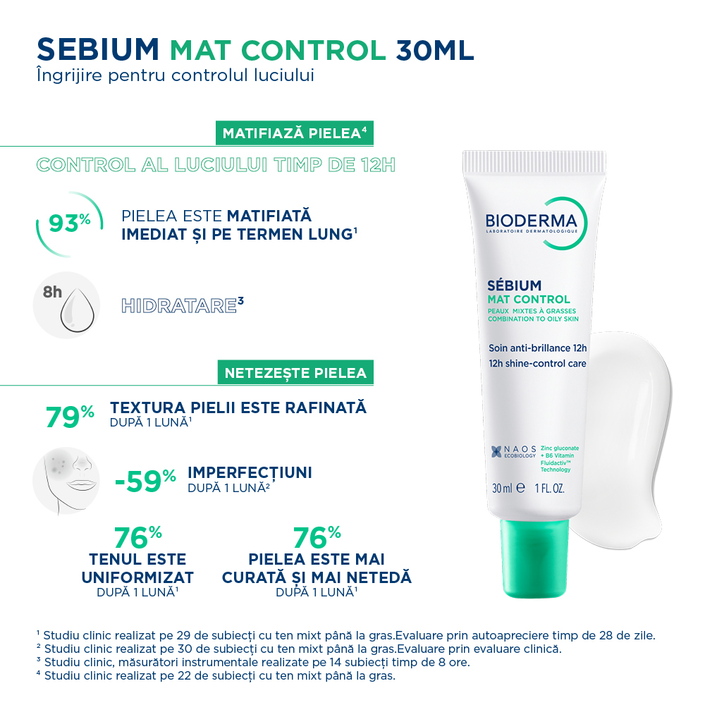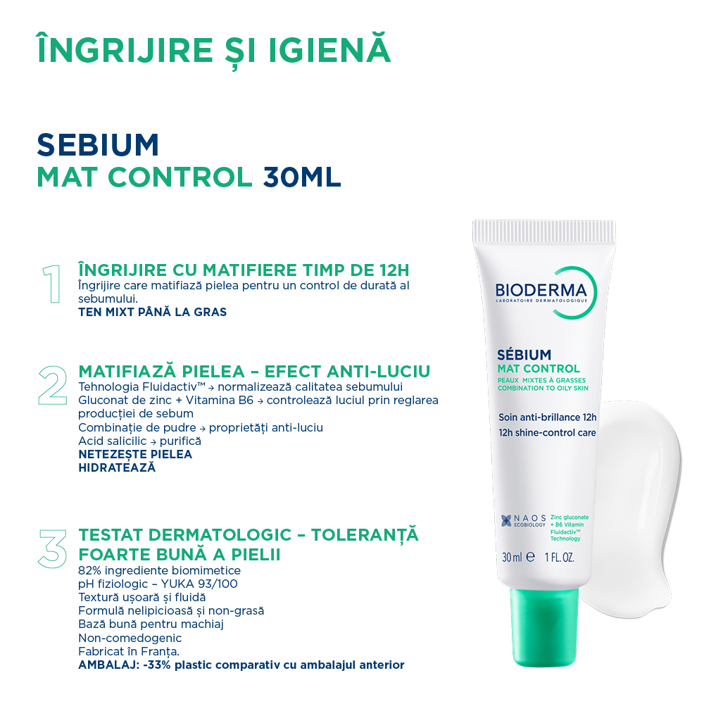 - matifiaza pielea mixta si grasa, reducand aspectul lucios;