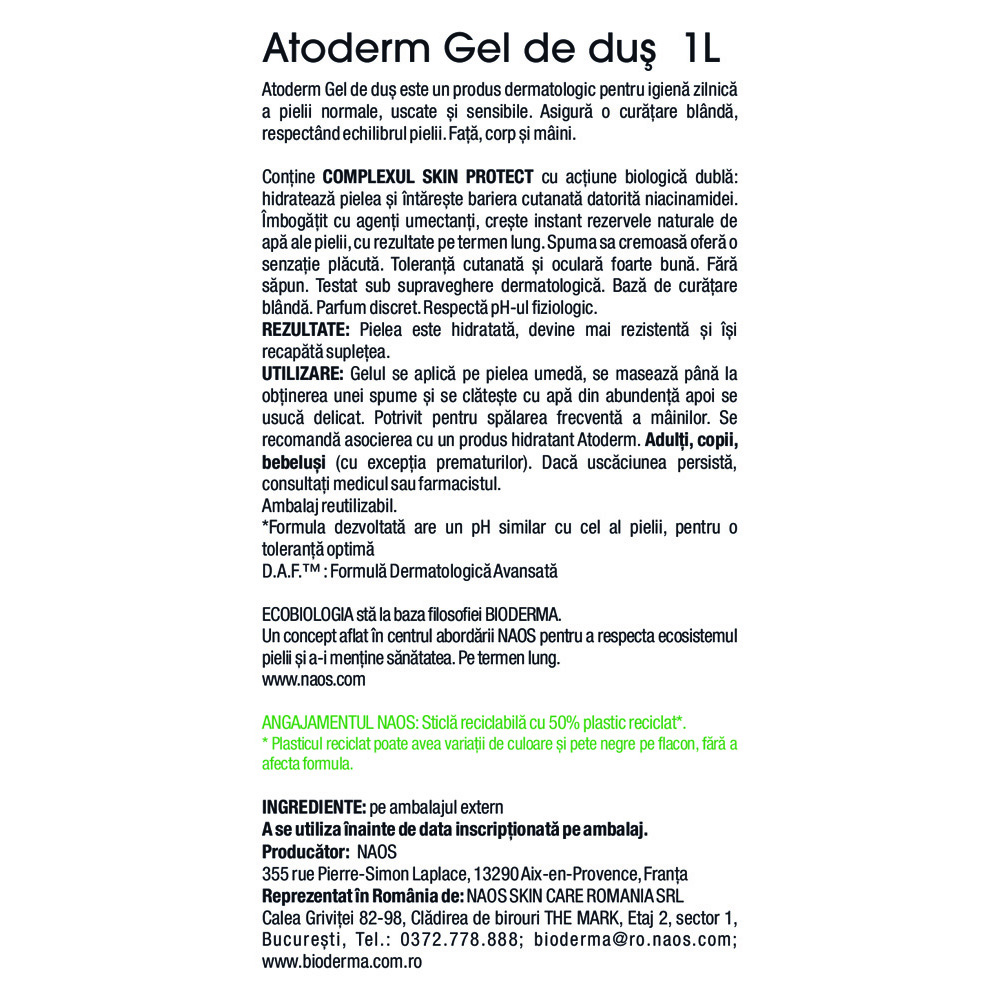 Precautii:Sticla reciclabila cu 50% plastic reciclat. Plasticul reciclat poate avea variatii de culoare si pete negre pe flacon, fara a afecta formula.