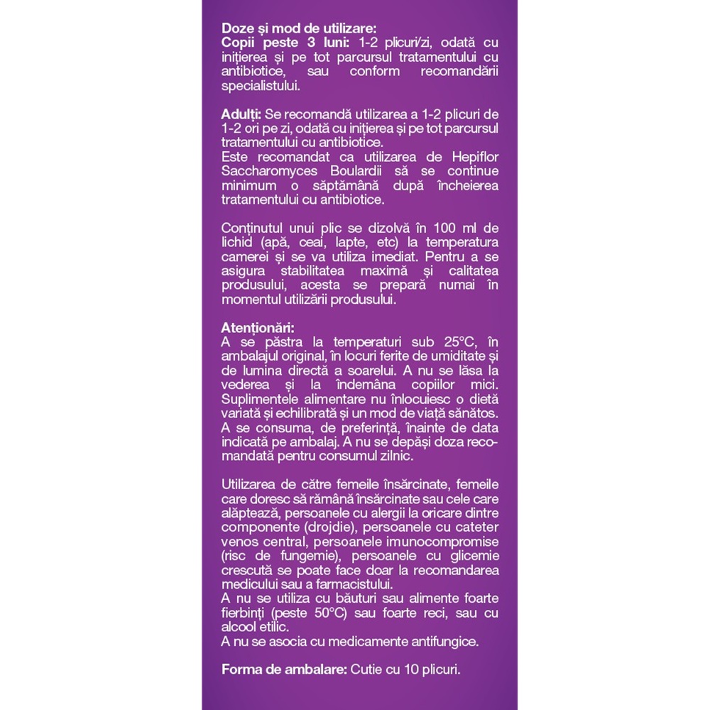 Este recomandat ca utilizarea de Hepiflor Saccharomyces Boulardii sa se continue minimum o saptamana dupa incheierea tratamentului cu antibiotice.