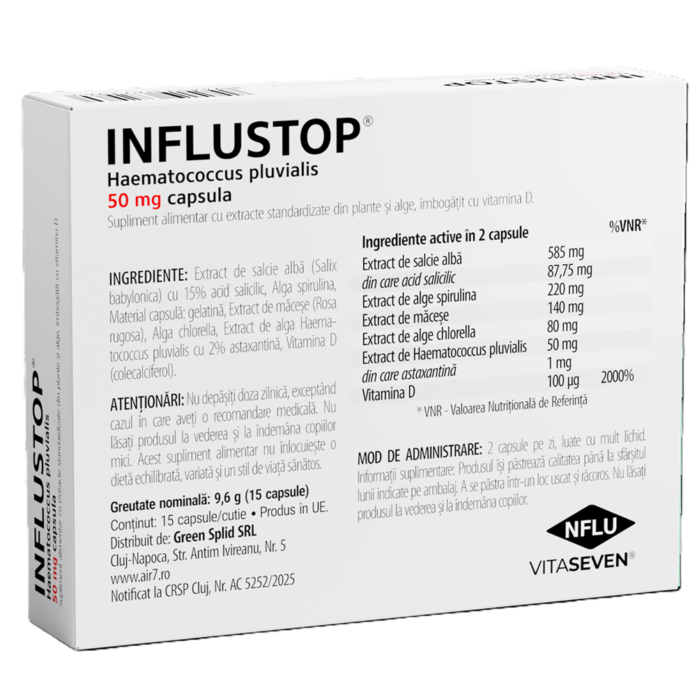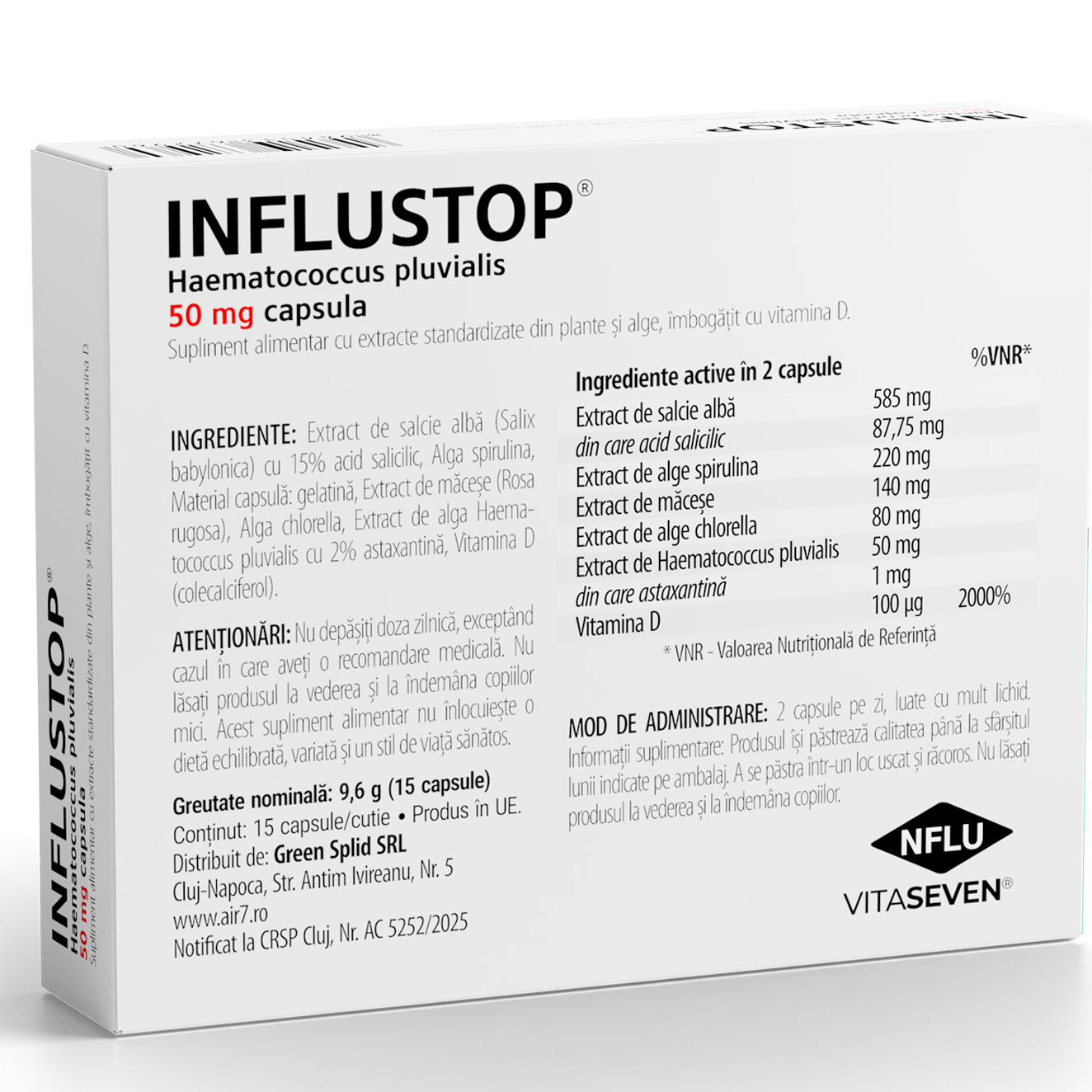 Influstop 50 mg 15 capsule Green Splid(supliment alimentar cu extracte standardizate din plante si alge, imbogatit cu vitamina D) face parte din categoria supliment alimentar.