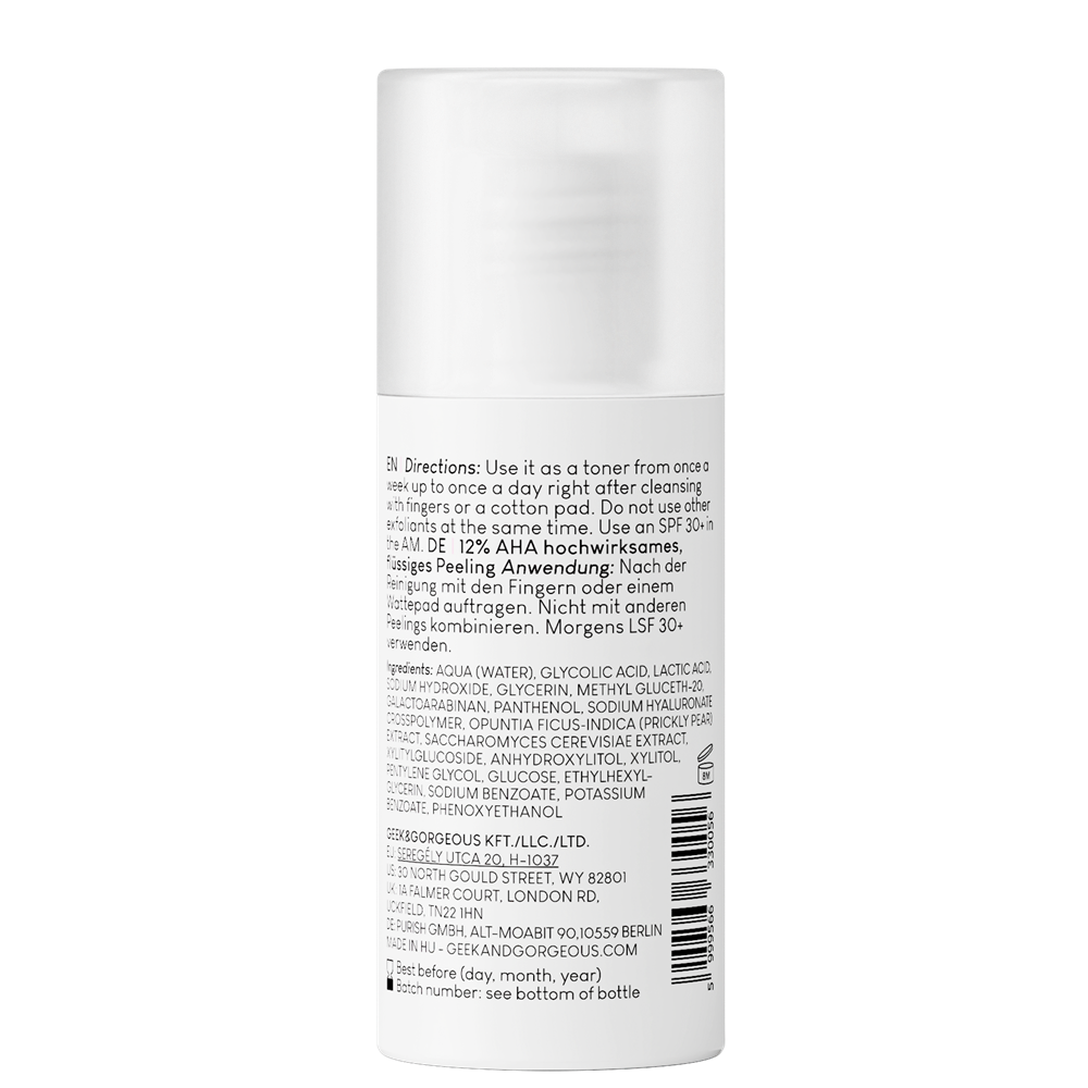 Exfoliantul cel mai puternic de la Geek&Gorgeous, formulat special pentru lupta anti-imbatranire, contine 12% AHA + Extract de Cactus.