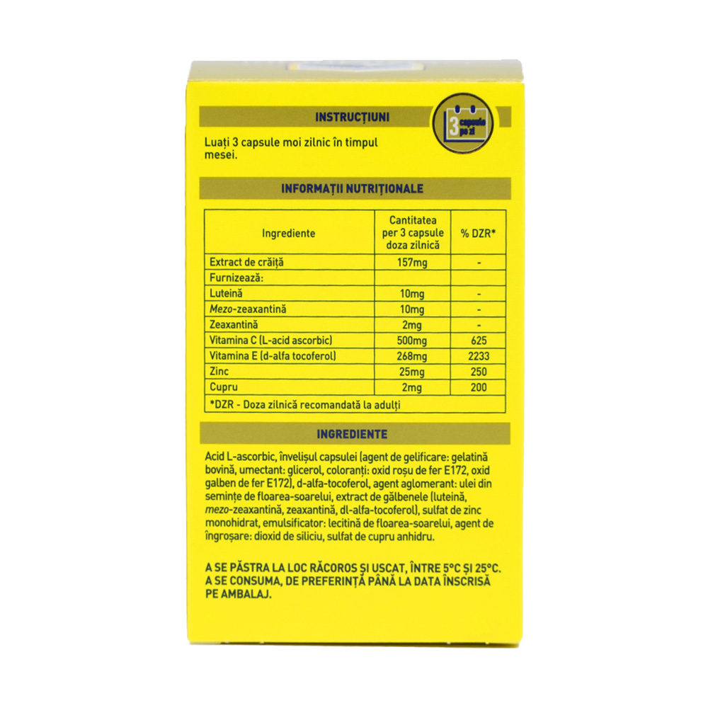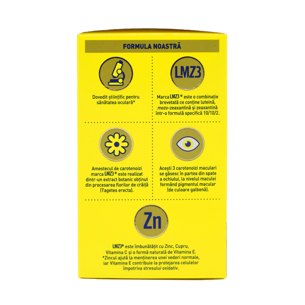 - combina cele trei carotenoizi maculari intr-o formula unica ce contine mezo-zeaxantina, luteina, zeaxantina, zinc, vitamina C, vitamina E si cupru;