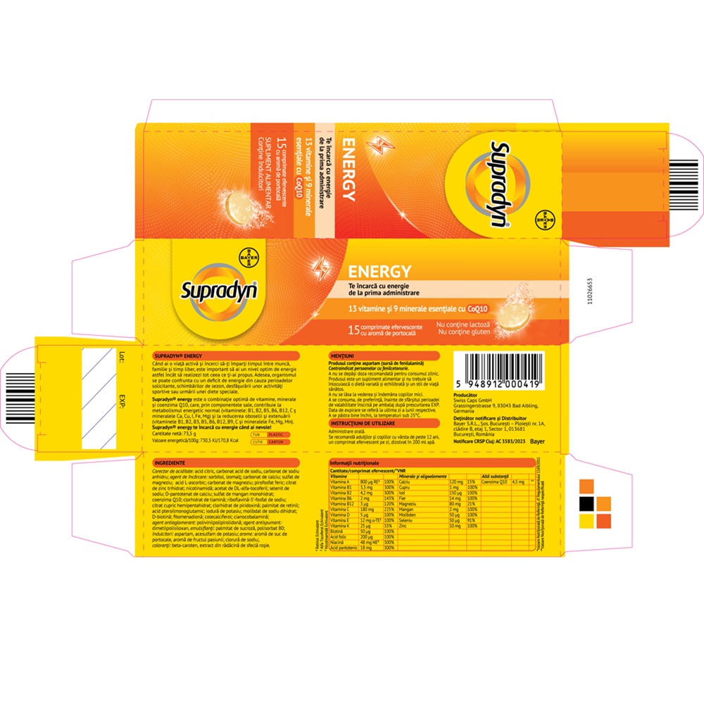 Ingrediente:Corector de aciditate: acid citric, carbonat acid de sodiu, carbonat de sodiu anhidru; agent de încărcare: sorbitol, izomalț; carbonat de calciu; sulfat de magneziu; acid L-ascorbic; carbonat de magneziu; pirofosfat feric; citrat de zinc trihidrat; nicotinamidă; acetat de DL-alfa-tocoferil; selenit de sodiu; D-pantotenat de calciu; sulfat de mangan monohidrat; coenzima Q10; clorhidrat de tiamină; riboflavină-5'-fosfat de sodiu; citrat cupric hemipentahidrat; clorhidrat de piridoxină; palmitat de retinil; acid pteroilmonoglutamic; iodură de potasiu; molibdat de sodiu dihidrat;D-biotină; fitomenadionă; colecalciferol; cianocobalamină; agent antiaglomerant: polivinilpolipirolidonă; agent antispumant: dimetilpolisiloxan, emulsifianți: palmitat de sucroză, polisorbat 80; îndulcitori: aspartam, acesulfam de potasiu; arome: aromă de suc de portocale, aromă de fructul pasiunii; clorură de sodiu; coloranți: beta-caroten, extract din rădăcină de sfeclă roșie.
