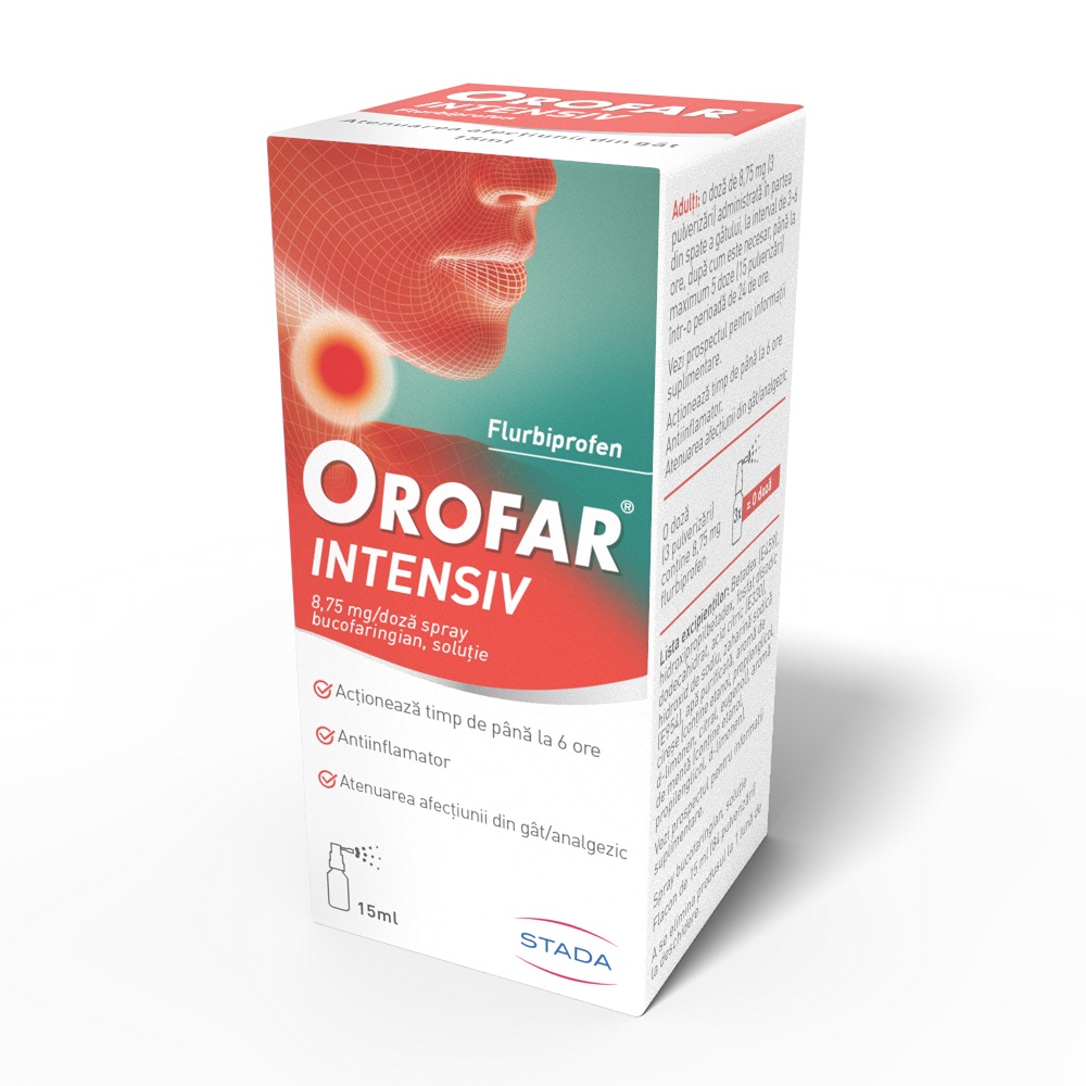 Orofar Intensiv conține flurbiprofen. Flurbiprofenul aparține unui grup de medicamente denumite anti-inflamatoare nesteroidiene (AINS) care acționează prin schimbarea modului în care organismul răspunde la durere, inflamație și febră mare.