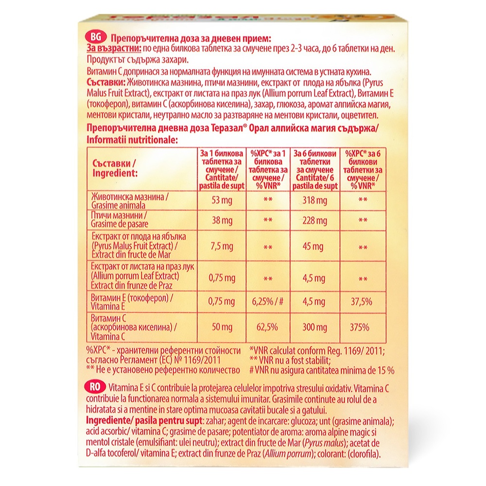 Pe pastila pentru supt: zahar; agent de incarcare: glucoza, unt (grasime animala), acid acsorbic/ vitamina C, grasime de pasare, potentiator de aroma: aroma alpine magic si mentol cristale (emulsifiant: ulei neutru), extract din fructe de Mar (Pyrus malus), acetat de D-alfa tocoferol/ vitamina E, extract din frunze de Praz (Allium porrum), colorant: (clorofila).