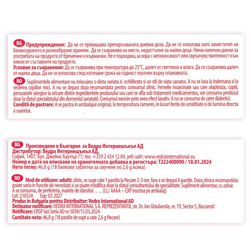 - supliment alimentar cu o formula care asigura un consum mai usor si poate avea actiune asupra cavitatii bucale si a gatului;