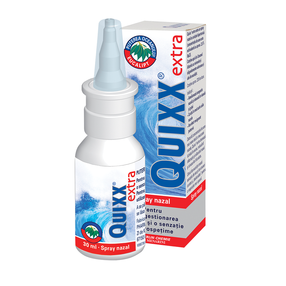 Quixx® Extra este un ajutor natural pentru cavitatea nazală congestionată È™i sinusurile blocate. ConÈ›ine apă din Oceanul Atlantic cu minerale È™i oligoelemente valoroase. ConcentraÈ›ia de sare din QUIXX® Extra este mai mare decât cea din mucoasa nazală, creând astfel presiune osmotică, care ajută la decongestionare. Datorită concentraÈ›iei crescute de sare, QUIXX® Extra reduce excesul de lichid, reducând congestia È™i ameliorând simptomele de nas È™i sinusuri înfundate. În plus, QUIXX® Extra conÈ›ine ulei de eucalipt revigorant, care oferă senzaÈ›ia de nas liber È™i curat pentru o respiraÈ›ie mai uÈ™oară.