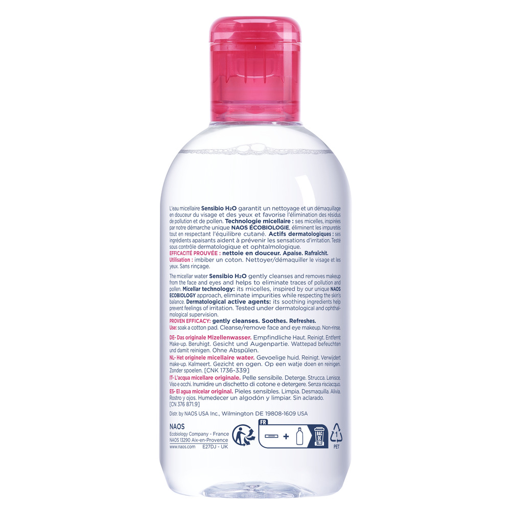 INDICAŢII: Apă micelară pentru pielea sensibilă. Curăţă delicat și îndepărtează machiajul de pe faţă și conturul ochilor.