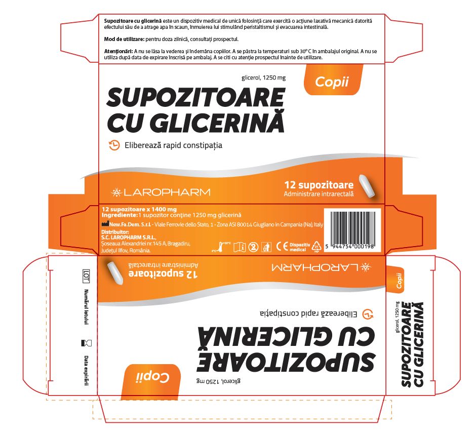 Supozitoare cu glicerină este un dispozitiv medical de unică folosinţă, pe bază de glicerină sub formă de supozitoare, indicat pentru a facilita activitatea de evacuare în caz de constipaţie. Este indicat şi pentru copii.