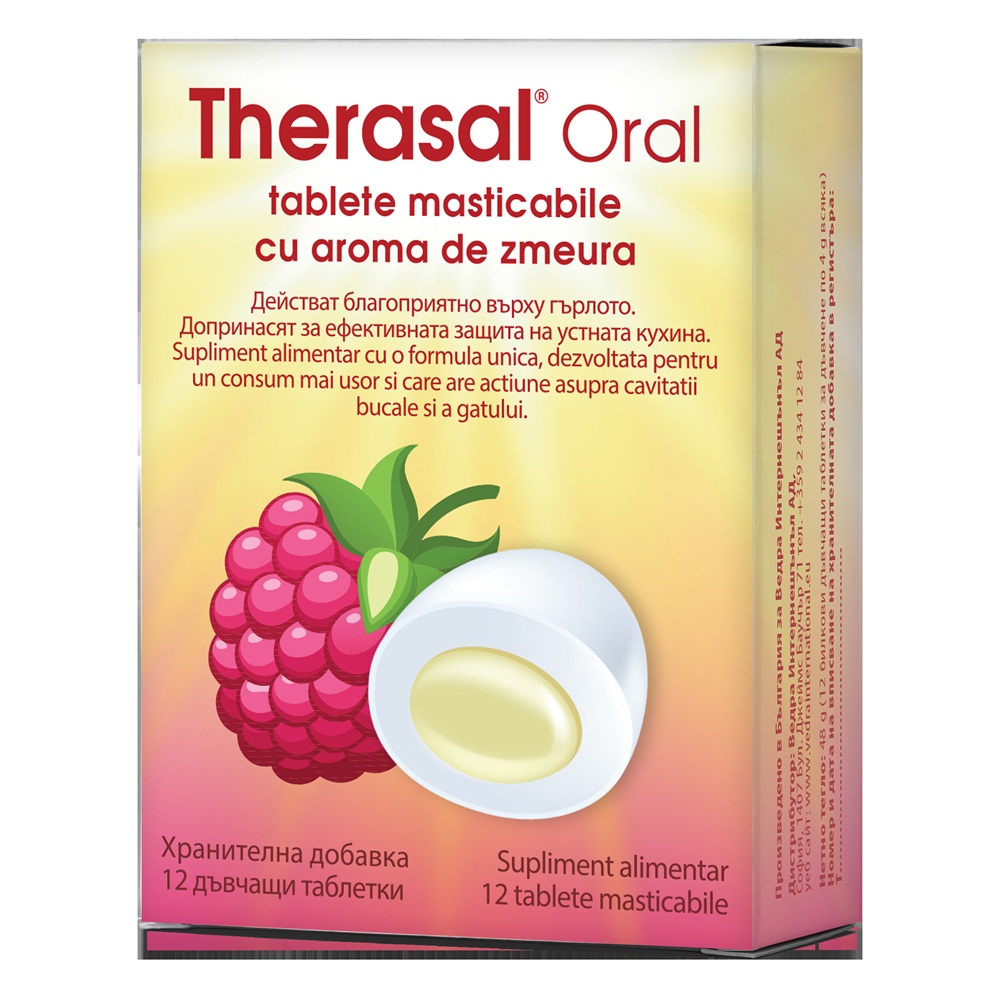 - supliment alimentar cu zahar sub forma de tablete masticabile cu gust placut de zmeura;