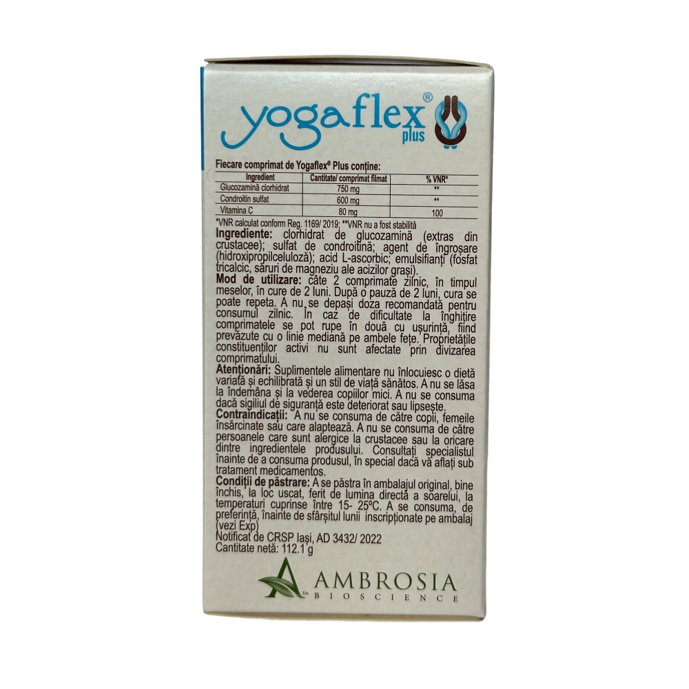 Yogaflex Plus 60 comprimate filmate Ambrosia Bioscience(poate contribui la sustinerea sanatatii articulatiilor) face parte din categoria supliment alimentar.