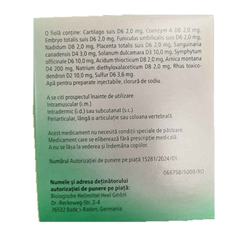 - Substanţele active sunt: O fiolă conține: Cartilago suis D6 2,0 mg, Coenzym A D8 2,0 mg, Embryo totalis suis D6 2,0 mg, Funiculus umbilicalis suis D6 2,0 mg, Nadidum D8 2,0 mg, Placenta totalis suis D6 2,0 mg, Sanguinaria canadensis D4 3,0 mg, Solanum dulcamara D3 10,0 mg, Symphytum officinale D6 10,0 mg, Acidum thiocticum D8 2,0 mg, Arnica montana D4 200 mg, Natrium diethyloxalaceticum D8 2,0 mg, Rhus toxicodendron D2 10,0 mg, Sulfur D6 3,6 mg.