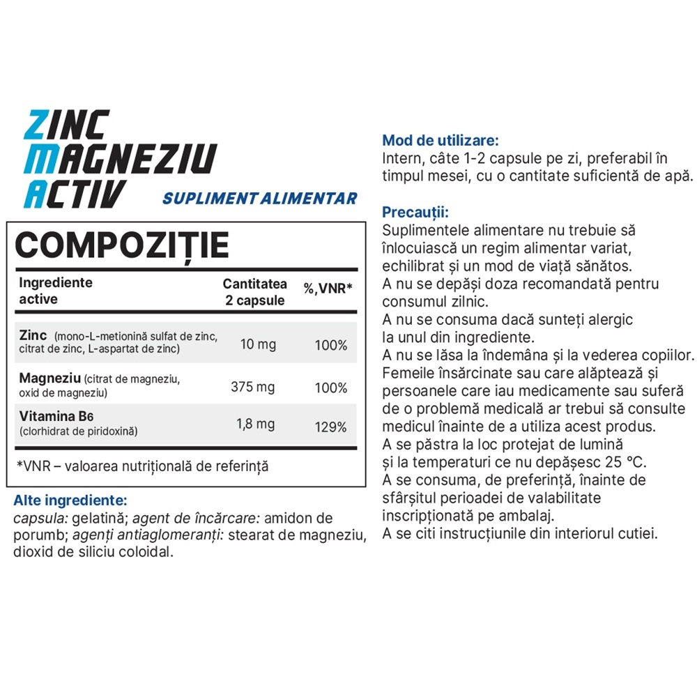 | Zinc (mono-L-metionină sulfat de zinc, citrat de zinc, L-aspartat de zinc) | 10 mg | 100% |