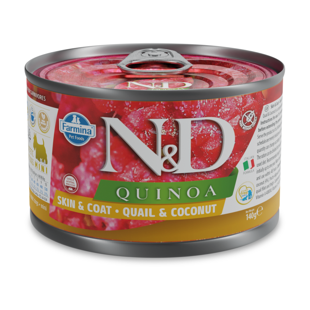 File si pulpa de prepelita (55%), seminte de quinoa extrase (5%), ulei de peste, cocos (4%), fructo-oligozaharide, sulfat de condroitina, glucozamina, vitamine, minerale. Sursa proteica: file si pulpa de prepelita. Sursa de carbohidrati: seminte de quinoa extrase.