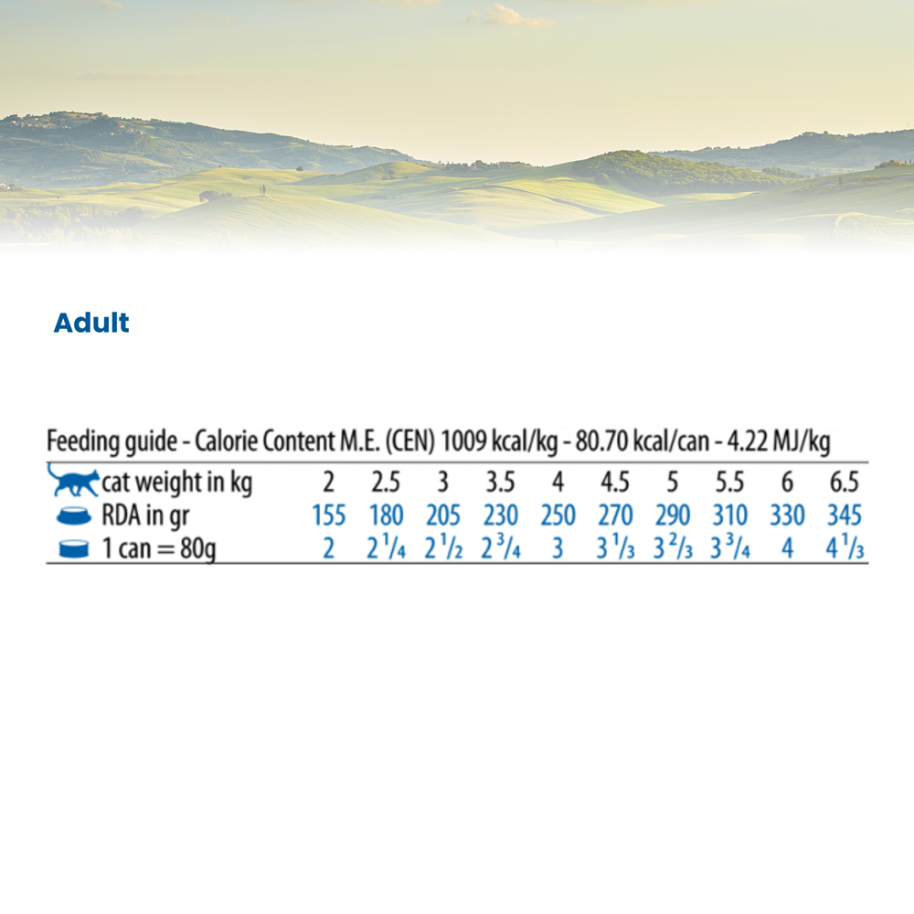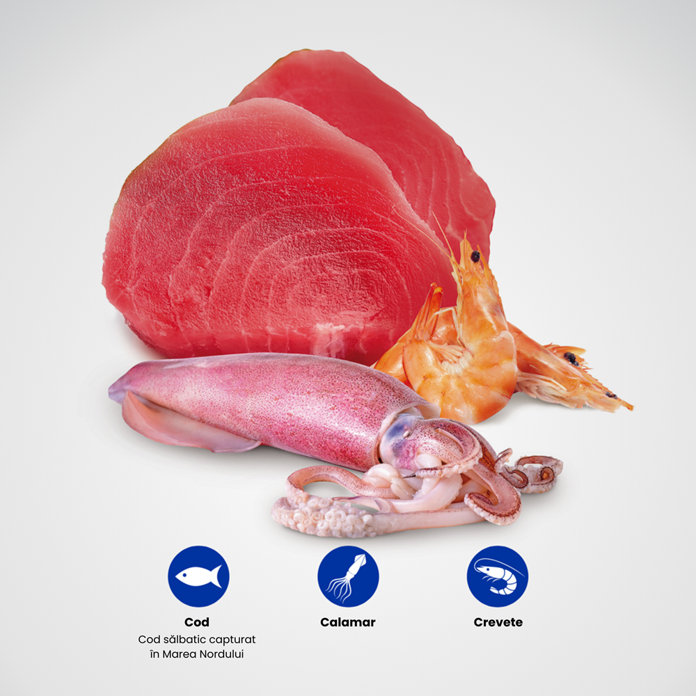 Ton (55%), calamar (10%), creveti (5%), ulei de peste, grasimi animale, fructo-oligozaharide, sulfat de condroitina, glucozamina, vitamine, minerale.