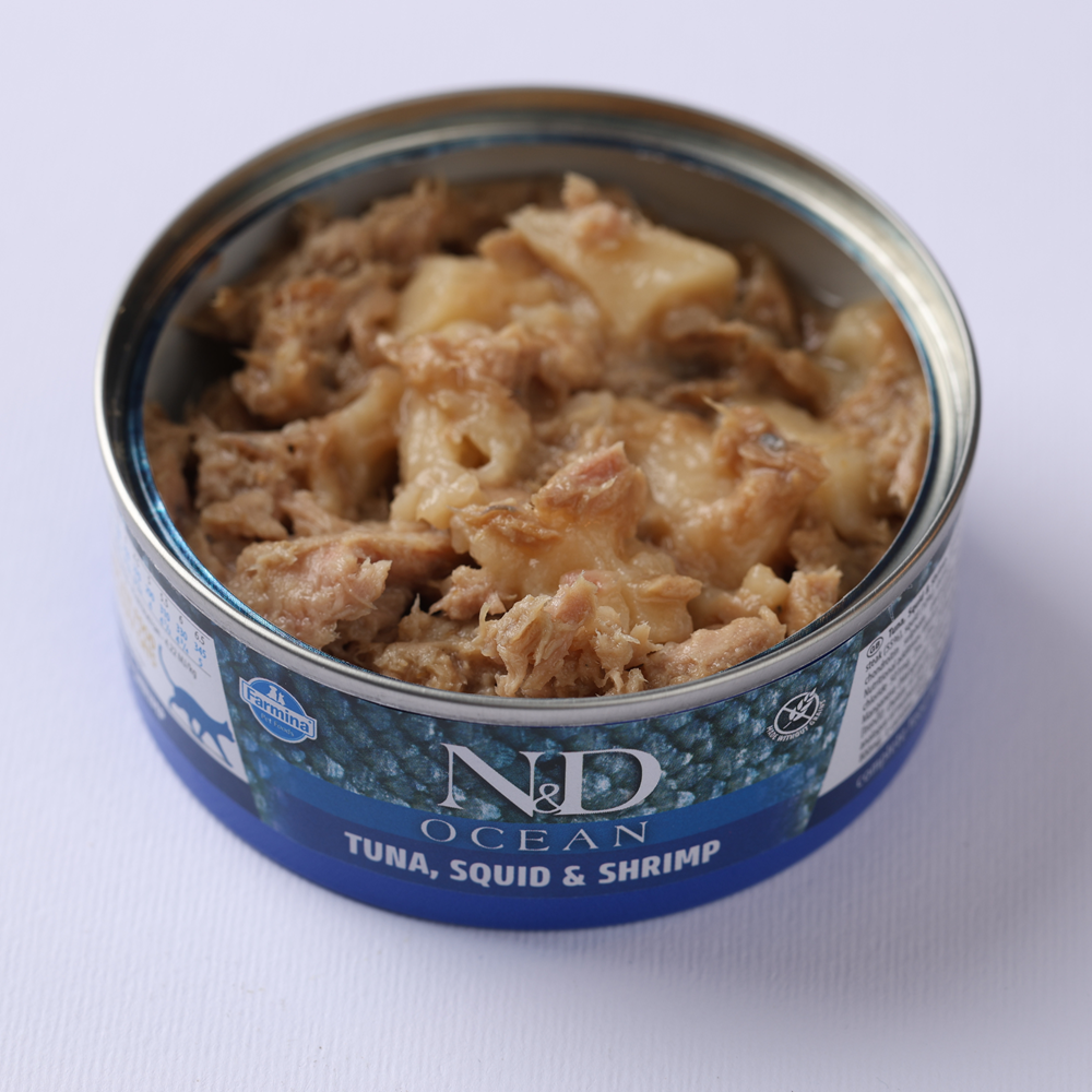 Hrana umeda cu ton, calamar si creveti pentru pisici N&D Ocean, 70 g, Farmina [8606014102024]