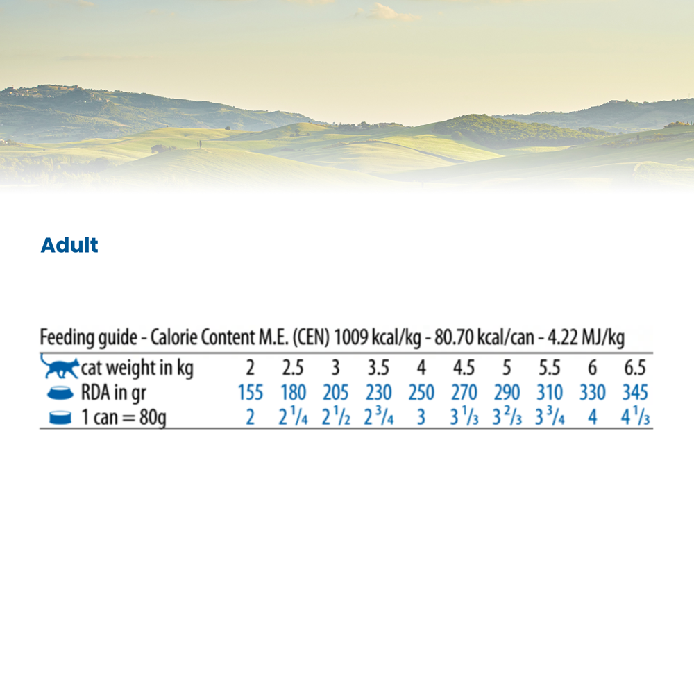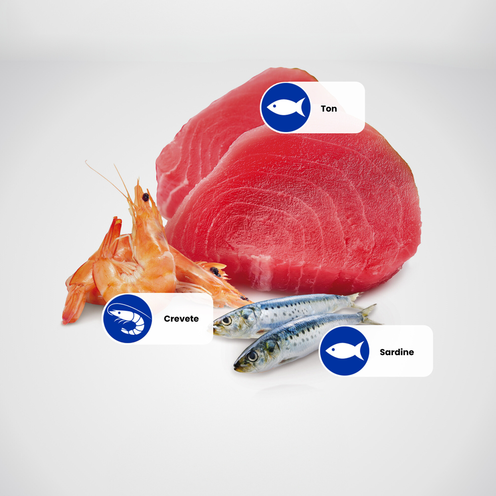 Ton (55%), sardine (10%), creveti (5%), ulei de peste, grasimi animale, fructo-oligozaharide, sulfat de condroitina, glucozamina, vitamine, minerale.