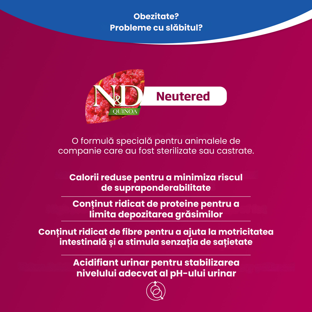 - formulata stiintific pentru caini care au fost sterilizate si ajuta la combaterea tendintei de supraponderabilitate, asigurand in acelasi timp o nutritie optima si o stare generala de bine;