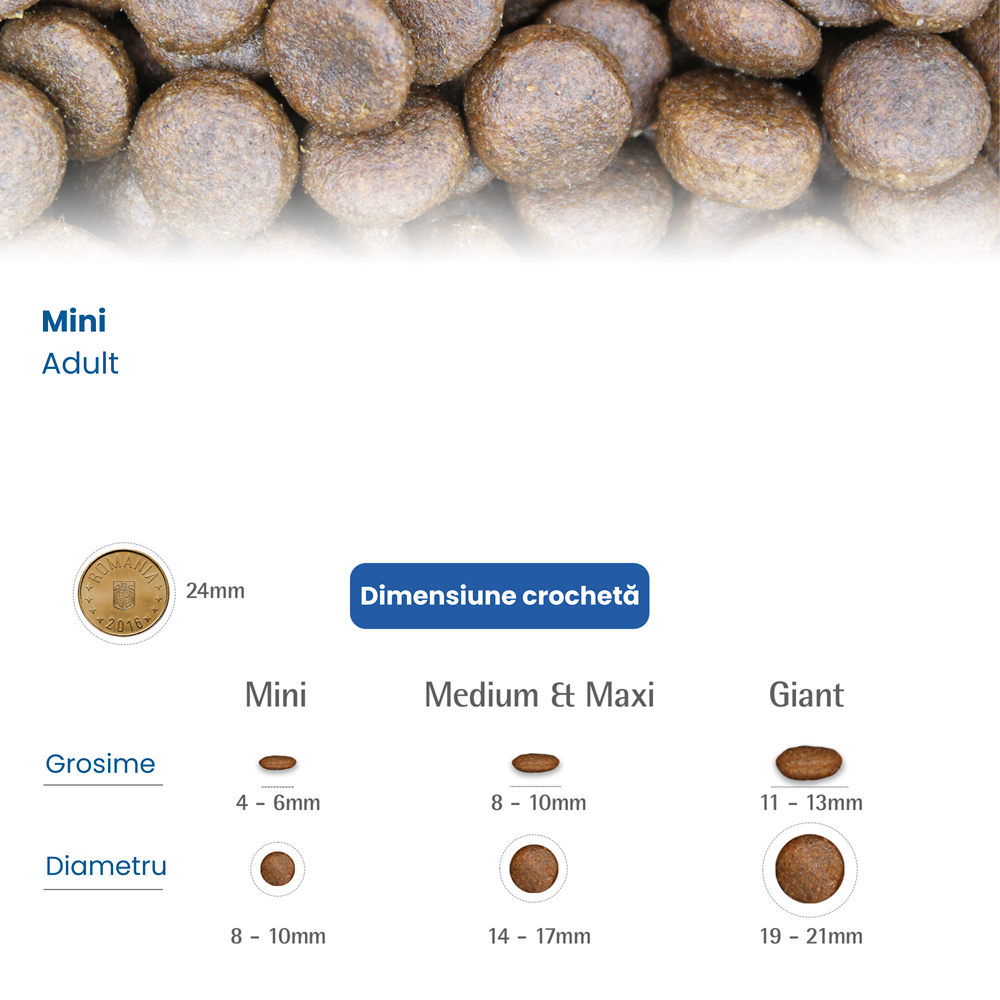 Constituenti analitici:Proteine brute 27.00%; Grasimi brute 16.00%; Fibre brute 2.70%; Umiditate 9.00%; Cenusa bruta 7.50%; Calciu 0.90%; Fosfor 0.80%; Omega‐6 3.00%; Omega‐3 0.70%; DHA 0.35%; EPA 0.15%; Glucozamina 1000mg/kg; Sulfat de condroitina 700mg/kg.