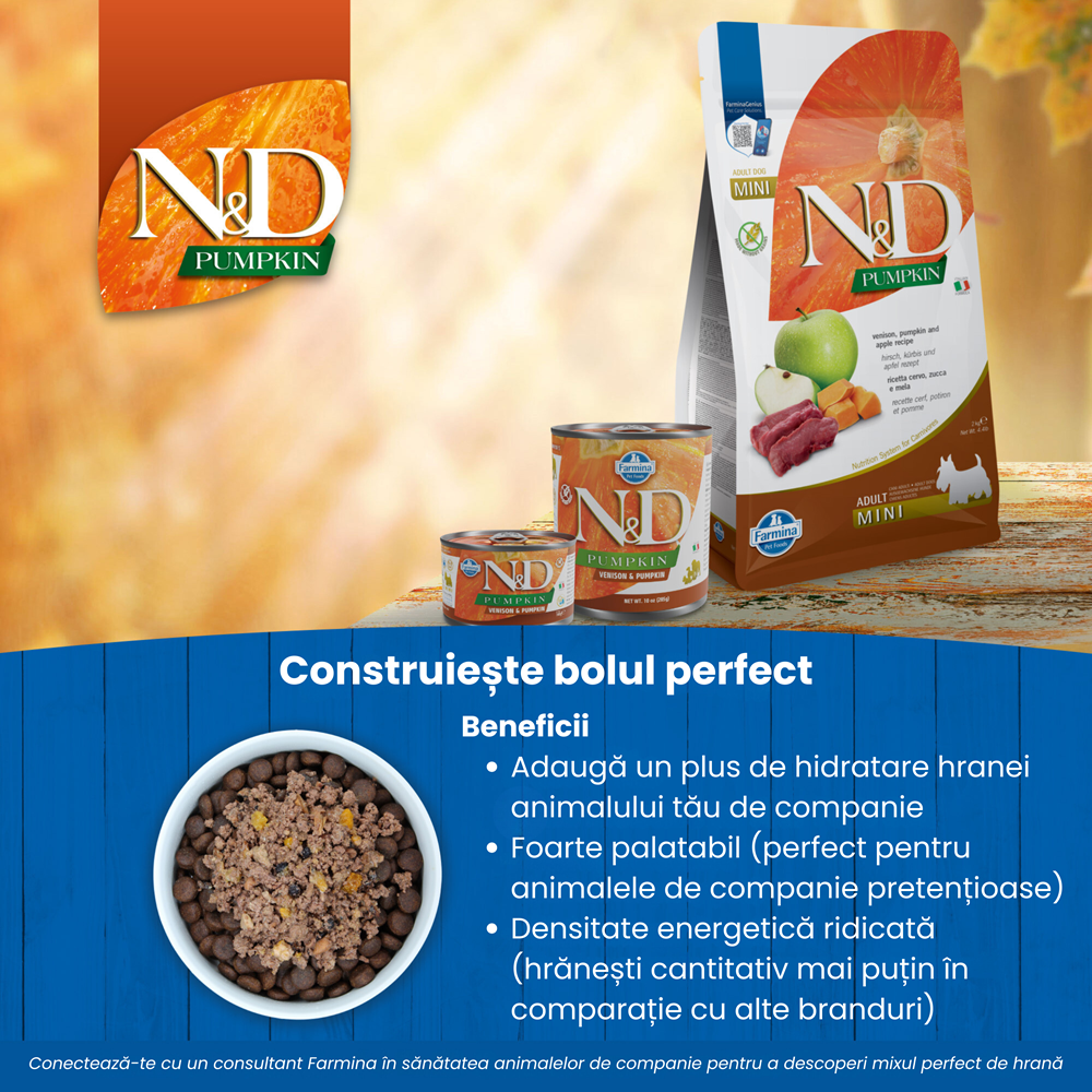 carne de vanat (22%), proteine deshidratate din carne de vanat (20%), cartofi dulci, grasime de pui, dovleac uscat (5%), oua uscate, hering, proteine deshidratate din hering, ulei de peste (din hering), fibre de mazare, morcov uscat, faina de lucerna, inulina, fructo-oligozaharide, extract de drojdie (sursa de manno-oligo-zaharide), mere uscate (0,5%), rodii uscate, spanac uscat, coji si seminte de psyllium, portocale dulci uscate, afine uscate, clorura de sodiu, drojdie de bere uscata, curcuma (0,2%), extract de aloe vera, glucozamina, sulfat de condroitina.