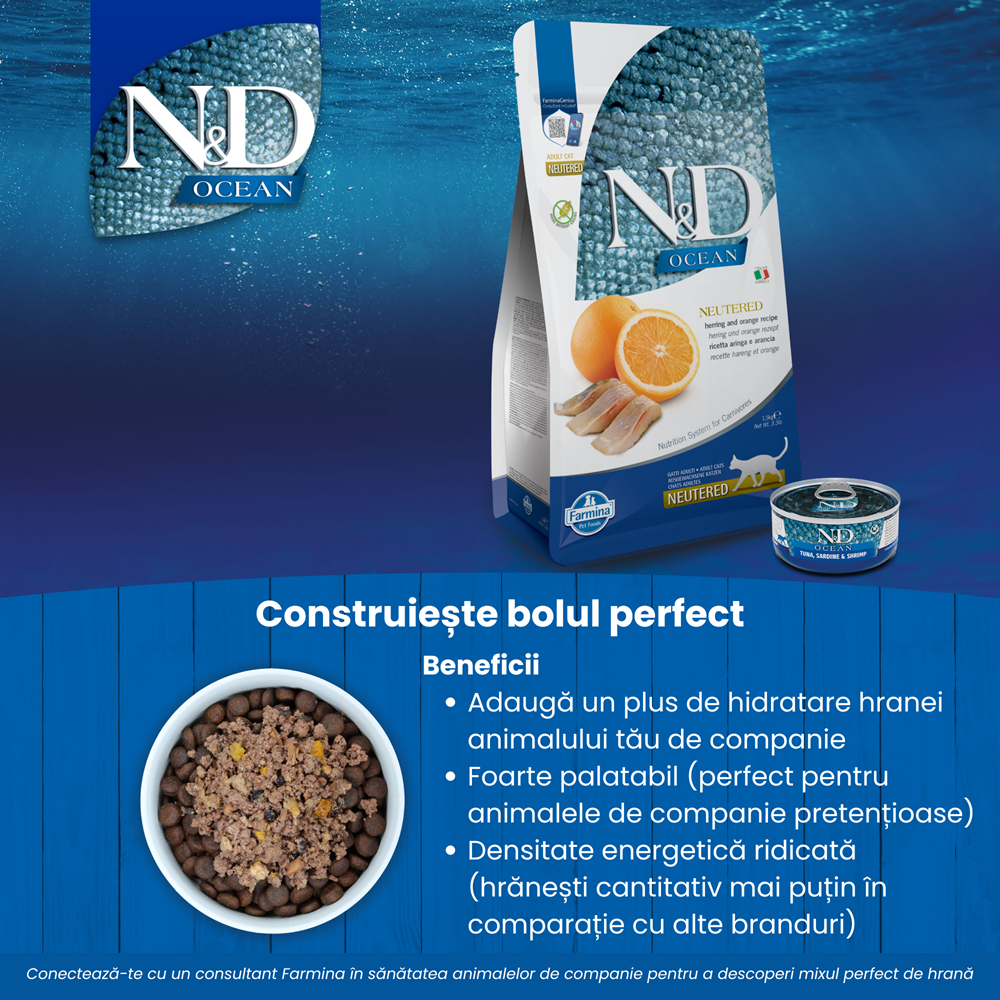 Constituenti analitici:Proteine brute 46,00%; grasimi brute 11,00%; fibre brute 5,10%; umiditate 8,00%; cenusa bruta 8,90%; calciu 1,00%; fosfor 0,90%; magneziu 0,08%; omega-6 1,80%; omega-3 0,60%; DHA 0,35%; EPA 0,15%.