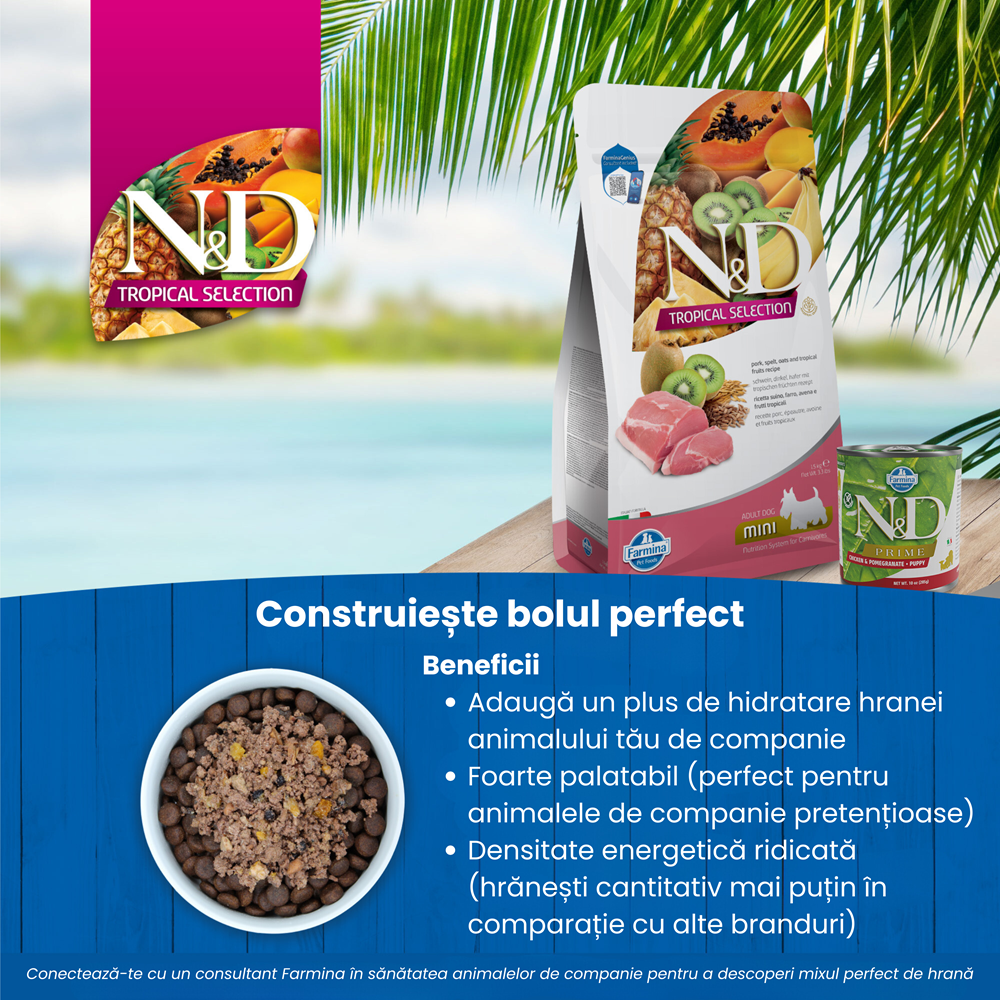Porc (20%), proteina deshidratata de porc (20%), alac (12%), ovaz (12%), grasime de pui, proteina deshidratata de hering, pulpa de sfecla uscata, ulei de peste (din hering), morcovi uscati, faina de lucerna, inulina, fructo-oligozaharide, extract de drojdie (sursa de mano-oligozaharide), banane uscate (0.5%), kiwi uscat (0.5%), mango uscat (0.5%), papaya uscata (0.5%), ananas uscat (0.5%), spanac uscat, tarate si seminte de psyllium, clorura de sodiu, drojdie de bere uscata, curcuma, extract de aloe vera, glucozamina, sulfat de condroitina.