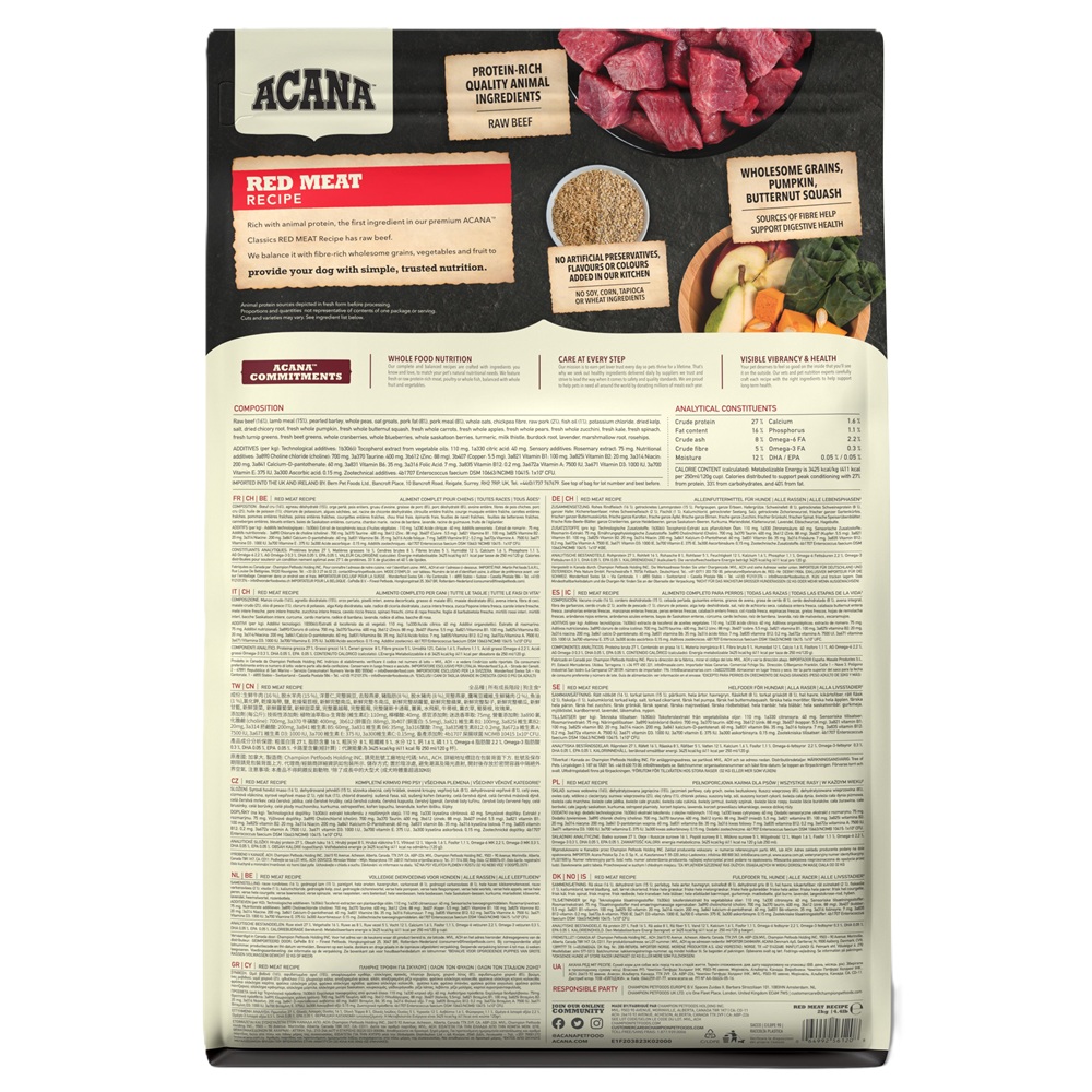 Carne de vita cruda (16%), miel deshidratat (15%), orz decorticat, mazare integrala, ovaz decorticat, grasime de porc (8%), porc deshidratat (8%), ovaz integral, fibre de naut, carne de porc cruda (2%), ulei de peste (1%), clorura de potasiu, varec uscat, sare, radacina de cicoare deshidratata, dovleac integral proaspat, dovleac de placinta proaspat, morcovi proaspeti integrali, mere proaspete integrale, pere proaspete integrale, zucchini intreg proaspat, varza proaspata, spanac proaspat, rapita proaspata, sfecla proaspata, afine intregi, coacaze intregi, fructe de padure saskatoon intregi, turmeric, armurariu, radacina de brusture, levantica, radacina de nalba mare, macese.