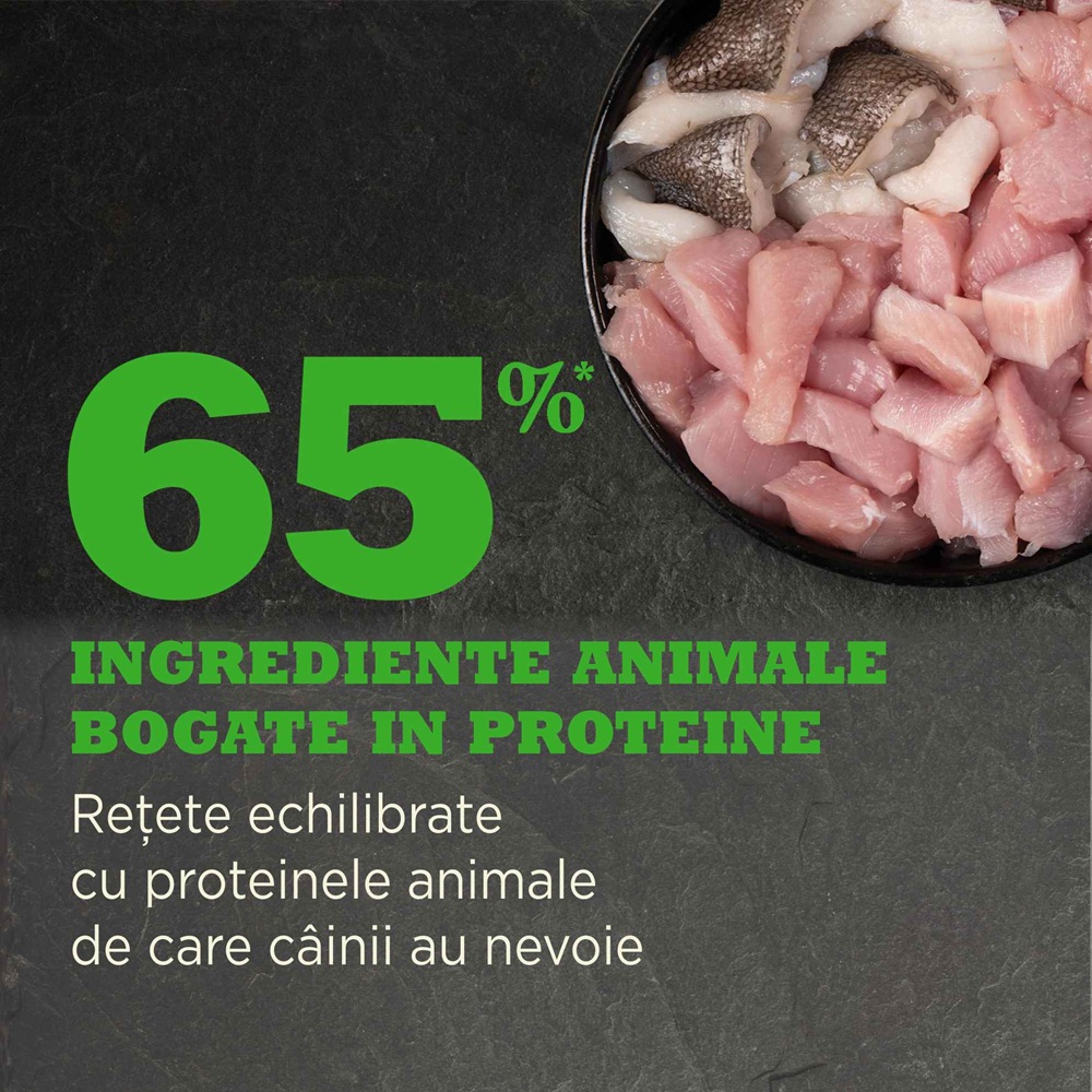 - contine ingrediente din carne de pui, curcan si peste proaspat, furnizand nutrienti esentiali pentru cainii seniori;
