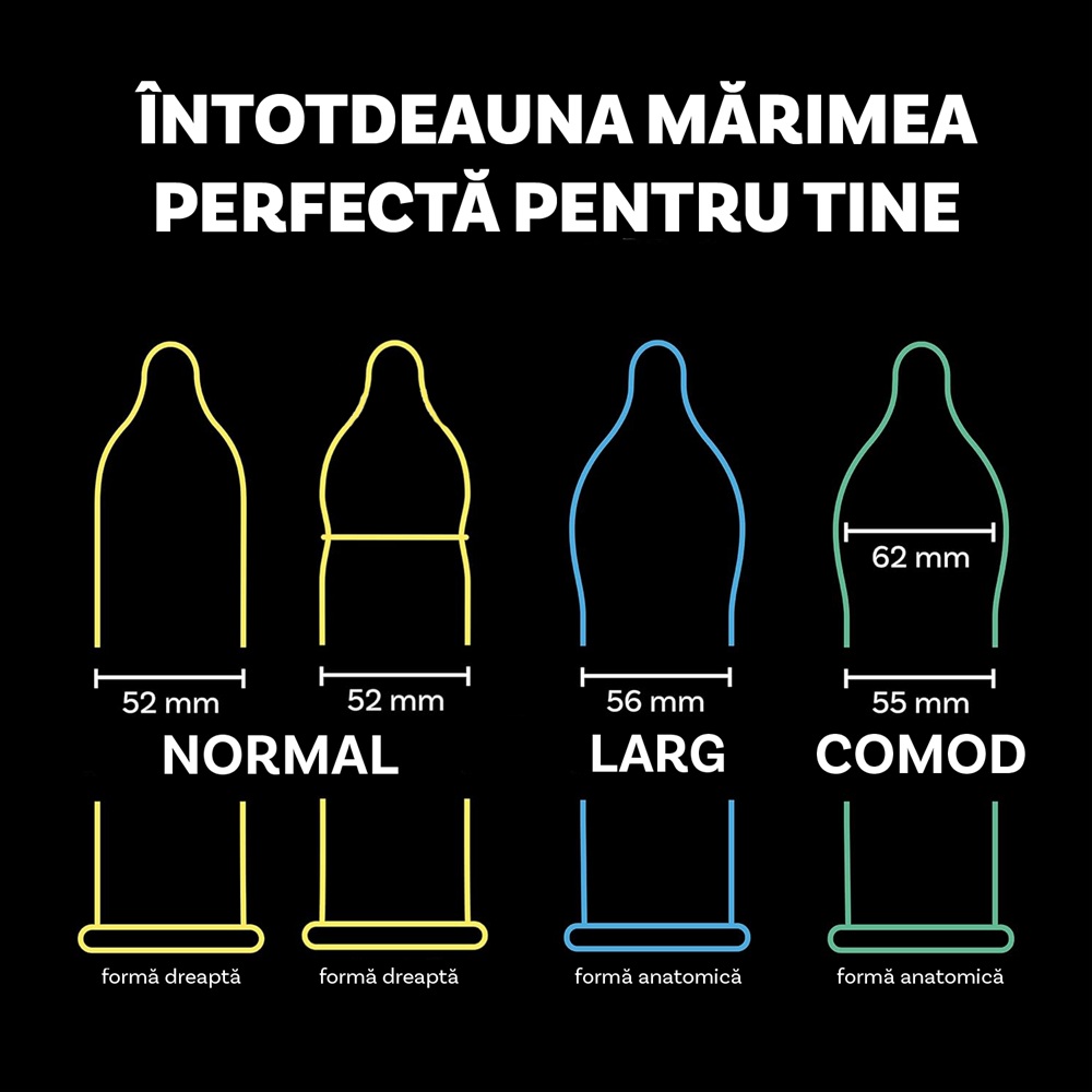 - 5 prezervative transparente, forma anatomica, netede, cu mai mult spatiu in partea superioara (diametru: 55 mm, 62 mm in partea superioara);