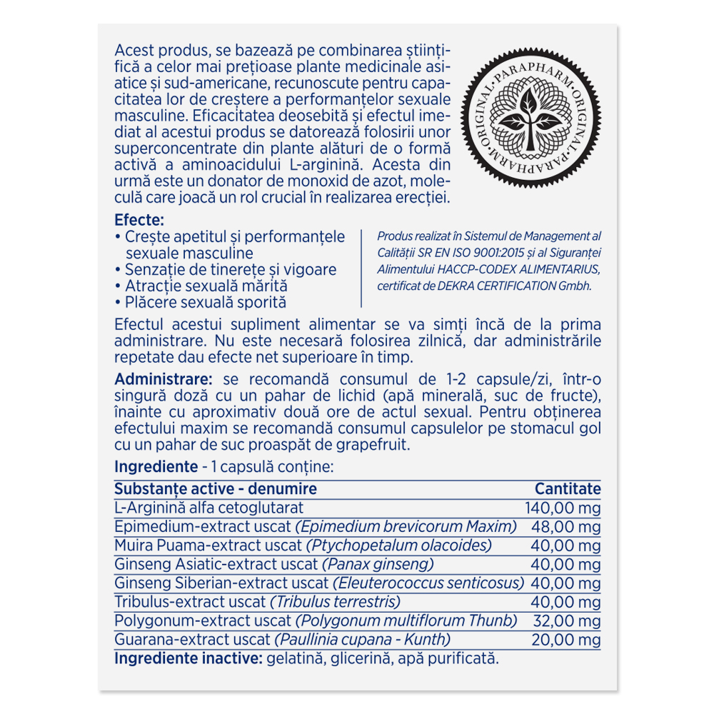 Extract de Muira puama 10:1, extract de Catuaba 1:1, extract de Ginseng siberian, extract de Guarana 5:1, extract de Tribulus terrestris 10:1, extract de Epimedium, extract de Polygonum multiflorum 10:1.