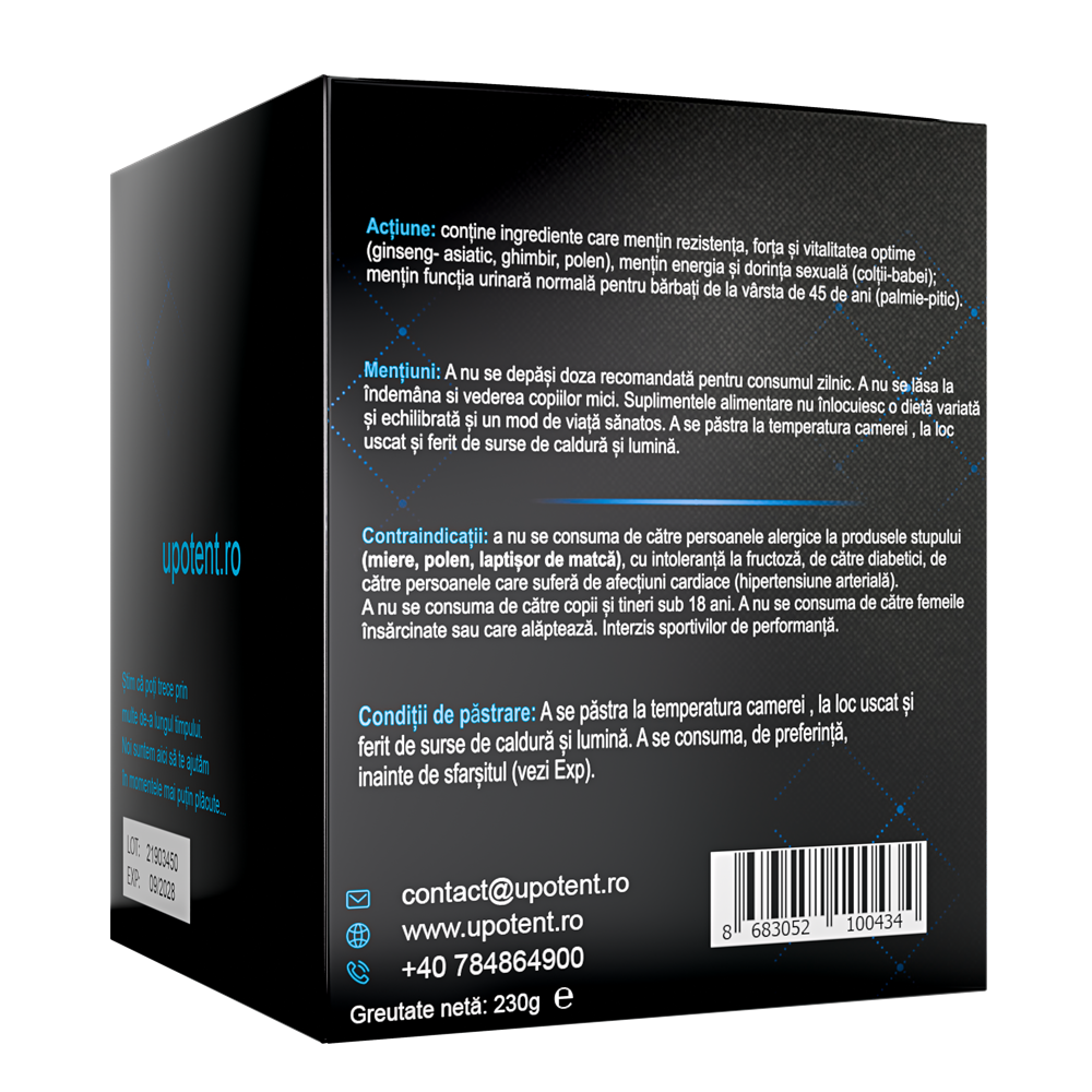Ingrediente:Miere 30 %, pastă de roșcove (Ceratonia siliqua) 20 %, pastă de dude (Morus sp.) 15 %, extract din roșcove (Ceratonia siliqua) 10 %, rădăcină de ginseng asiatic (Panax ginseng) 5 %, fructe de palmier pitic (Serenoa repens) 5 %, frunze de ginkgo (Ginkgo biloba) 3 %, fructe de colții-babei (Tribulus terrestris) 3 %, polen 3 %, rădăcină de ghimbir (Zingiber officinale) 2 %, rădăcină de galangal (Alpinia galanga) 2 %, lăptișor de matcă 2%.