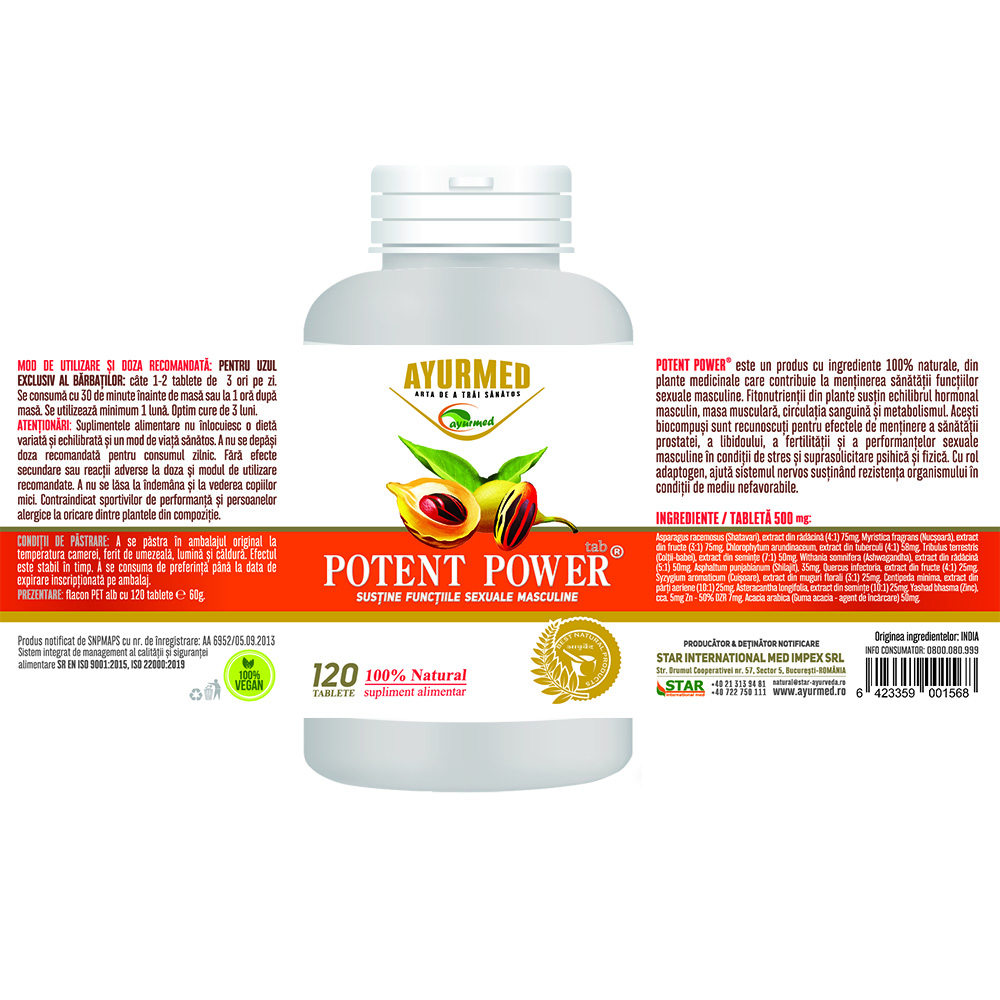 Asparagus racemosus (Shatavari), extract din radacina (4:1) 75mg, Myristica fragrans (Nucssoara), extract din fructe (3:1) 75mg, Tribulus terrestris (Coltii-babei), extract din seminte (7:1) 50mg,Chlorophytum arundinaceum (Safed musli), extract din tuberculi (4:1) 58mg, Withania somnifera (Ashwagandha), extract din radacina (5:1) 50mg, Asphaltum punjabianum (Shilajit), extract (6:1) 35mg, Quercus infectoria (Majuphal), extract din fructe (4:1) 25mg, Syzygium aromaticum (Cuisoare), extract din muguri florali (3:1) 25mg, Centipeda minima (Nakchikani), extract din parti aeriene (10:1) 25mg, Asteracantha longifolia (Talmakhana), extract din seminte (10:1) 25mg, Yashad bhasma (Zinc), cca. 5mg Zn – 50% DZR 7mg, Acacia arabica (Guma acacia – excipient) 50mg.
