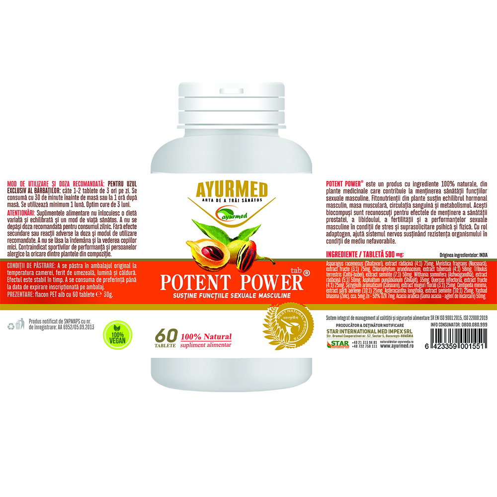 Asparagus racemosus (Shatavari), extract din radacina (4:1) 75mg, Myristica fragrans (Nucssoara), extract din fructe (3:1) 75mg, Tribulus terrestris (Coltii-babei), extract din seminte (7:1) 50mg,Chlorophytum arundinaceum (Safed musli), extract din tuberculi (4:1) 58mg, Withania somnifera (Ashwagandha), extract din radacina (5:1) 50mg, Asphaltum punjabianum (Shilajit), extract (6:1) 35mg, Quercus infectoria (Majuphal), extract din fructe (4:1) 25mg, Syzygium aromaticum (Cuisoare), extract din muguri florali (3:1) 25mg, Centipeda minima (Nakchikani), extract din parti aeriene (10:1) 25mg, Asteracantha longifolia (Talmakhana), extract din seminte (10:1) 25mg, Yashad bhasma (Zinc), cca. 5mg Zn – 50% DZR 7mg, Acacia arabica (Guma acacia – excipient) 50mg.