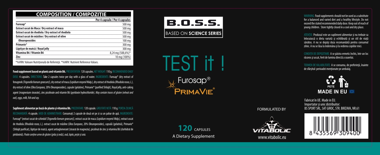 Furosap® 500 mg Primavie® 300 mg Extract uscat de Rhodiola 500 mg (10:1 concentrate) Extract uscat de măsline 500 mg Oleuropeosides 100 mg Zinc 10mg Extract uscat de Maca 500 mg (6:1 concentrate) Royal jelly 300 mg Vitamina B6 8,24 mg.