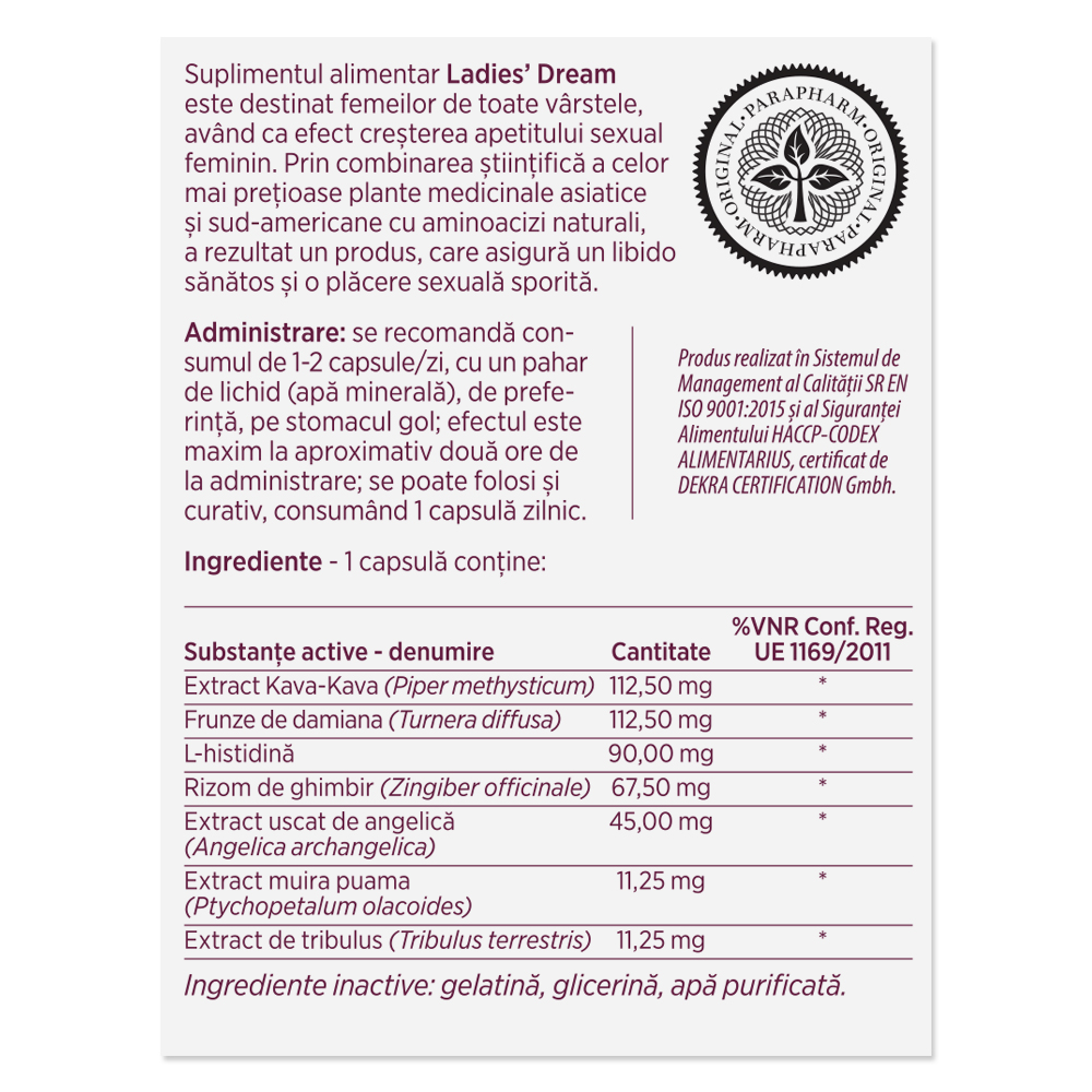 Ingrediente:Extract Piper methysticum - 112,50 mg; Frunze de damiană (Turnera diffusa) - 112,50 mg; L-histidină - 90,00 mg; Rizom de ghimbir (Zingiber officinale) - 67,50 mg;
