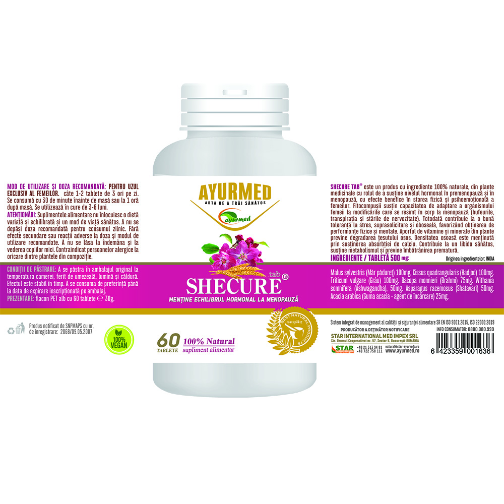 Malus sytvestris (Mar paduret) 100mg. Cissus quadrangularis (Hadjod) 100mg. Triticum vulgare (Grau) 100mg. Bacopa monnieri (Brahmi) 75mg. Withania somnifera (Ashwagandha), 50mg. Asparagus racemosus (Shatavari) 50mg. Acacia arabica (Guma acacia - agent de incarcare) 25mg.