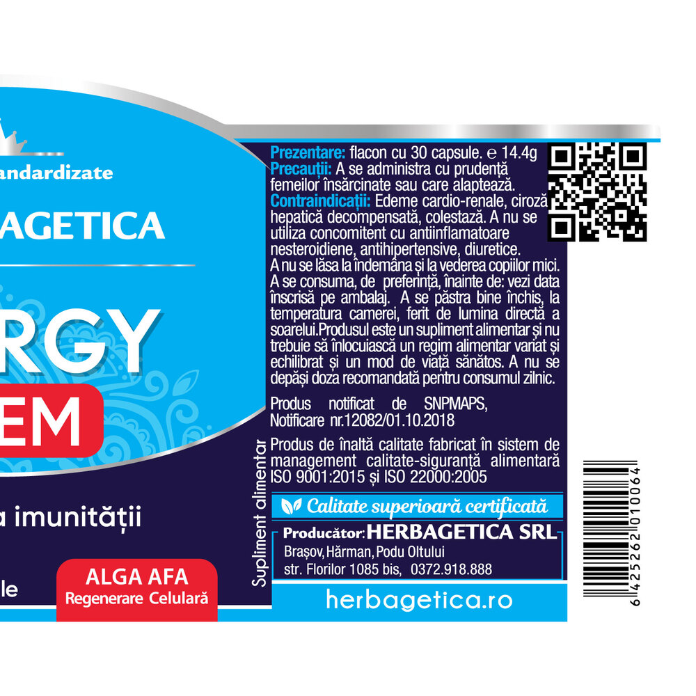 Extract 4:1 Trei-frati-patati 60 mg; Extract 10:1 Urzica standardizat 4% Polifenoli 60 mg; Extract 4:1 Acerola standardizat 17% Vitamina C naturala nativa 50 mg; Extract Lemn-dulce standardizat 12% Glicirizina 50 mg; Spirulina standardizata garantat 60% Proteine 50 mg; Alga Afa Originala, Organica (Aphanizomenon flos-aquae) 40 mg; Chlorella standardizata 50% Proteine 30 mg; Extract 10:1 Ganoderma lucidum standardizat 20% Polizaharide 40 mg; capsula: vegetala.