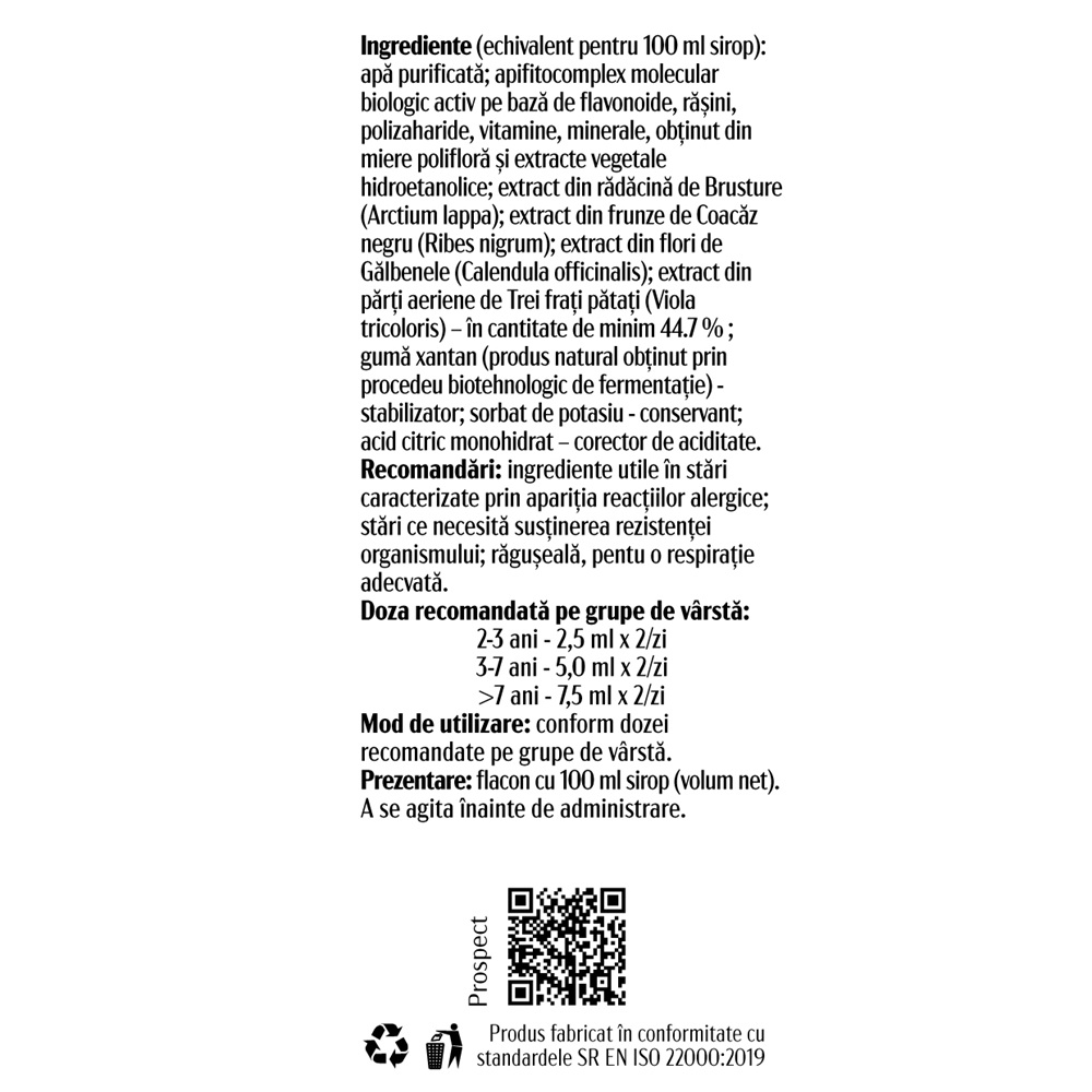 Echivalent pentru 100 ml sirop: apa purificata; apifitocomplex molecular biologic activ pe baza de flavonoide, rasini, polizaharide, vitamine, minerale, obtinut din miere poliflora si extracte vegetale hidroetanolice; extract din radacina de Brusture (Arctium lappa); extract din frunze de Coacaz negru (Ribes nigrum); extract din flori de Galbenele (Calendula officinalis); extract din parti aeriene de Trei frati patati (Viola tricoloris) - in cantitate de minim 44.7%; guma xantan (produs natural obtinut prin
