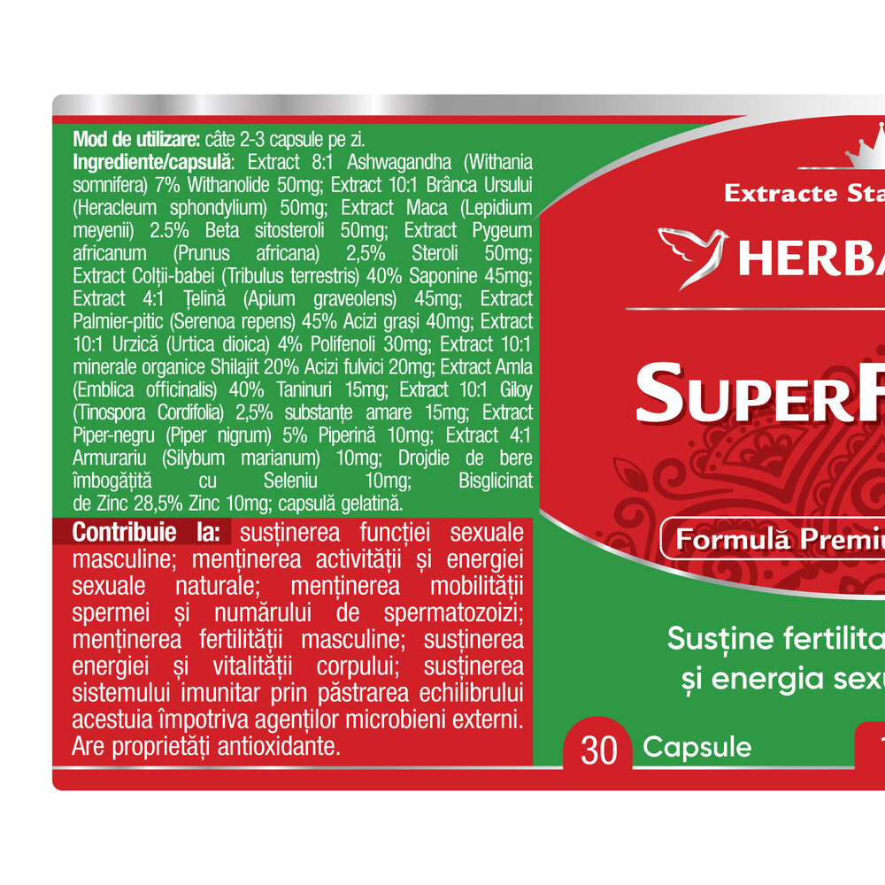 Extract 8:1 Ashwagandha (Withania somnifera) 7% Withanolide 50 mg; Extract 10:1 Branca Ursului (Heracleum sphondylium) 50 mg; Extract Maca (Lepidium meyenii) 2.5% Beta sitosteroli 50 mg; Extract Pygeum africanum (Prunus africana) 2,5% Steroli 50 mg; Extract Coltzi-babei (Tribulus terrestris) 40% Saponine 45 mg; Extract 4:1 Telina (Apium graveolens) 45 mg; Extract Palmier-pitic (Serenoa repens) 45% Acizi grasi 40 mg; Extract 10:1 Urzica (Urtica dioica) 4% Polifenoli 30 mg; Extract 10:1 minerale organice Shilajit 20% Acizi fulvici 20 mg; Extract Amla (Emblica officinalis) 40% Taninuri 15 mg; Extract 10:1 Giloy (Tinospora Cordifolia) 2,5% substante amare 15 mg; Extract Piper-negru (Piper nigrum) 5% Piperina 10 mg; Extract 4:1 Armurariu (Silybum marianum) 10 mg; Drojdie de bere imbogatita cu Seleniu 10 mg; Bisglicinat de Zinc 28,5% Zinc 10 mg; capsula: gelatina.