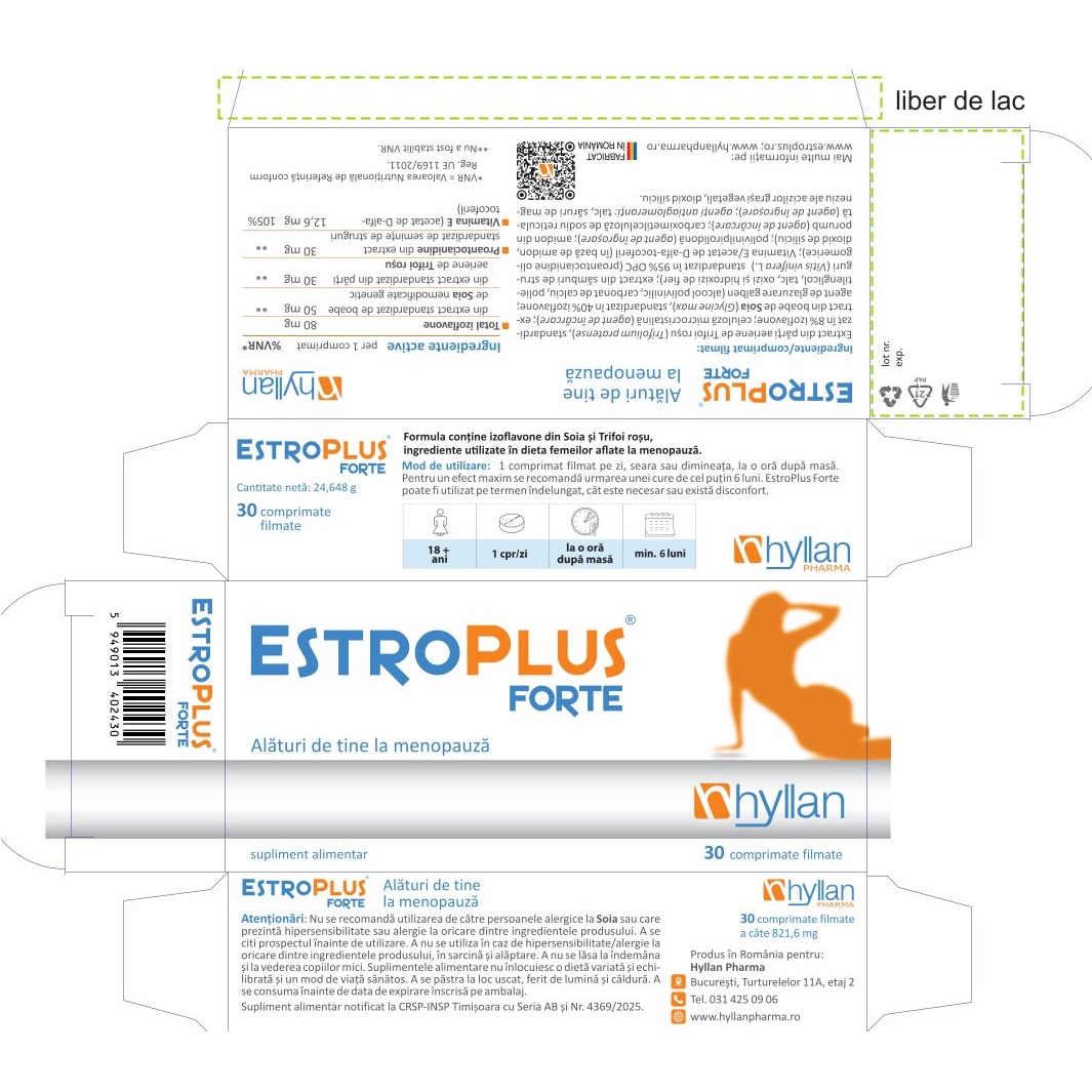 Mod de administrare:1 comprimat filmat pe zi, dimineata sau seara, la o ora dupa masa. Pentru un efect maxim se recomanda urmarea unei cure de minimum 6 luni. EstroPlus Forte poate fi utilizat pe termen indelungat, cat este necesar sau exista disconfort.