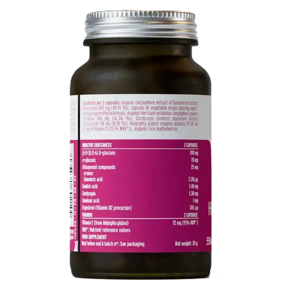 Ingrediente per 2 capsule: Pudra ecologica din carpofor de Hericium erinaceus (Herimax®) 280 mg, extract din miceliu de Cordyceps sinensis (Cordyzumib®) 240 mg, extract ecologic din carpofor de Ganoderma lucidum (Ganozumib®) 100 mg, extract din radacina de Ashwagandha (Withania somnifera) 100 mg, extract uscat din frunze de ceai verde (Camellia sinensis) 100 mg (55 mg (55%) (-) epigalocatechin-3-galat (EGCG) si 2 mg (2%) cofeina, agent de incarcare (celuloza microcristalina), agenti antiaglomeranti (stearat de magneziu vegetal, dioxid de siliciu), amestec bacterian (Bifidobacterium lactis (4×10⁸ UFC), Lactobacillus plantarum (4×10⁸ UFC), Bifidobacterium infantis (4×10⁸ UFC), Lactobacillus acidophilus (4×10⁸ UFC), Bifidobacterium longum (4×10⁸ UFC)), zinc (picolinat de zinc) 1,5 mg (15% VNR), vitamina B6 (clorhidrat de piridoxina) 0,22 mg (15% VNR), vitamina A (acetat de retinil) 120 µg (15% VNR), vitamina D (colecalciferol) 0,75 µg (15% VNR), capsula 100% vegetala (hidroxipropilmetilceluloza).