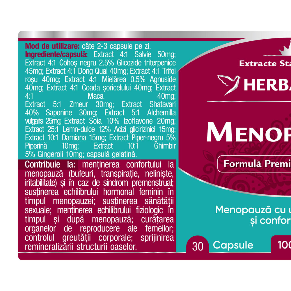 Extract 4:1 Salvie 50 mg; Extract 4:1 Cohos negru 2.5% Glicozide triterpenice 45 mg; Extract 4:1 Dong Quai 40 mg; Extract 4:1 Trifoi rosu 40 mg; Extract 4:1 Mielarea 0.5% Agnuside 40 mg; Extract 4:1 Coada soricelului 40 mg; Extract 4:1 Maca 40 mg; Extract 5:1 Zmeur 30 mg; Extract Shatavari 40% Saponine 30 mg; Extract 5:1 Alchemilla vulgaris 25 mg; Extract Soia 10% Izoflavone 20 mg; Extract 25:1 Lemn-dulce 12% Acizi glicirizinici 15 mg; Extract 10:1 Damiana 15 mg; Extract Piper-negru 5% Piperina 10 mg; Extract 10:1 Ghimbir 5% Gingeroli 10 mg; capsula: gelatina.