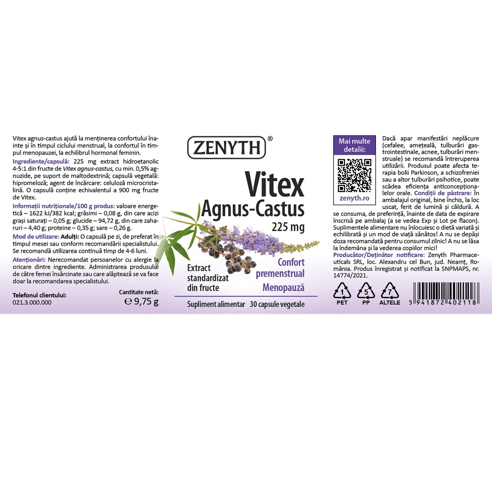 225 mg extract hidroetanolic 4–5:1 din fructe de Vitex agnus-castus, min. 0,5% agnuzide, suport de maltodextrină, capsulă vegetală (hipromeloză), agent de încărcare: celuloză microcristalină, echivalentul a 900 mg fructe de Vitex agnus-castus.