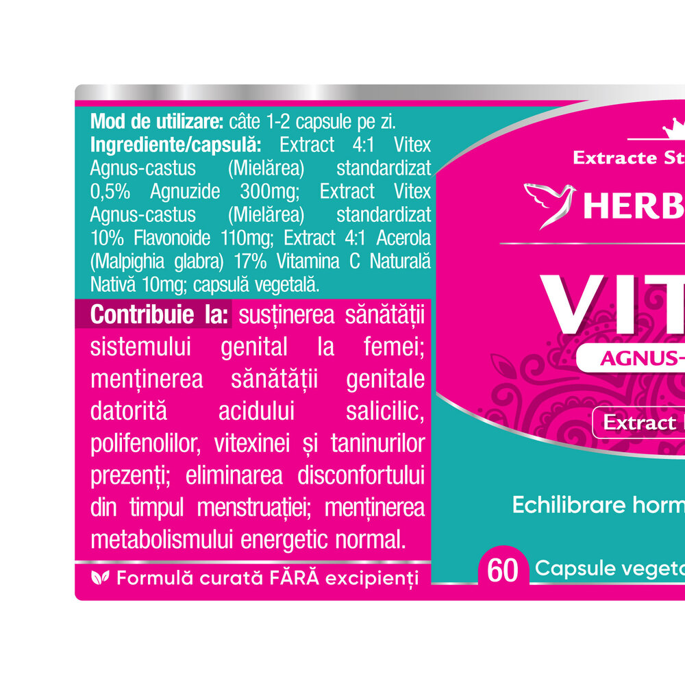 Extract 4:1 Vitex Agnus-castus (Mielarea) standardizat 0,5% Agnuzide 300 mg; Extract Vitex Agnus-castus (Mielarea) standardizat 10% Flavonoide 110 mg; Extract 4:1 Acerola (Malpighia glabra) 17% Vitamina C Naturala Nativa 10 mg; capsula: vegetala.