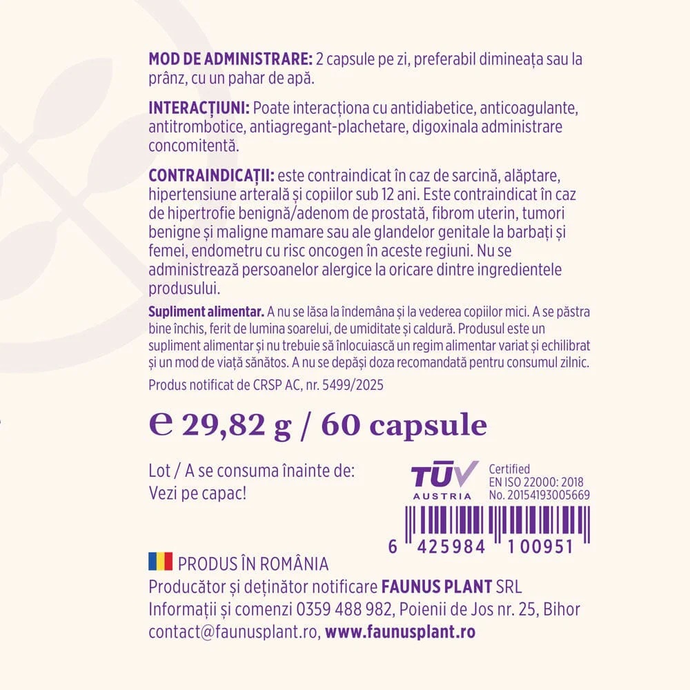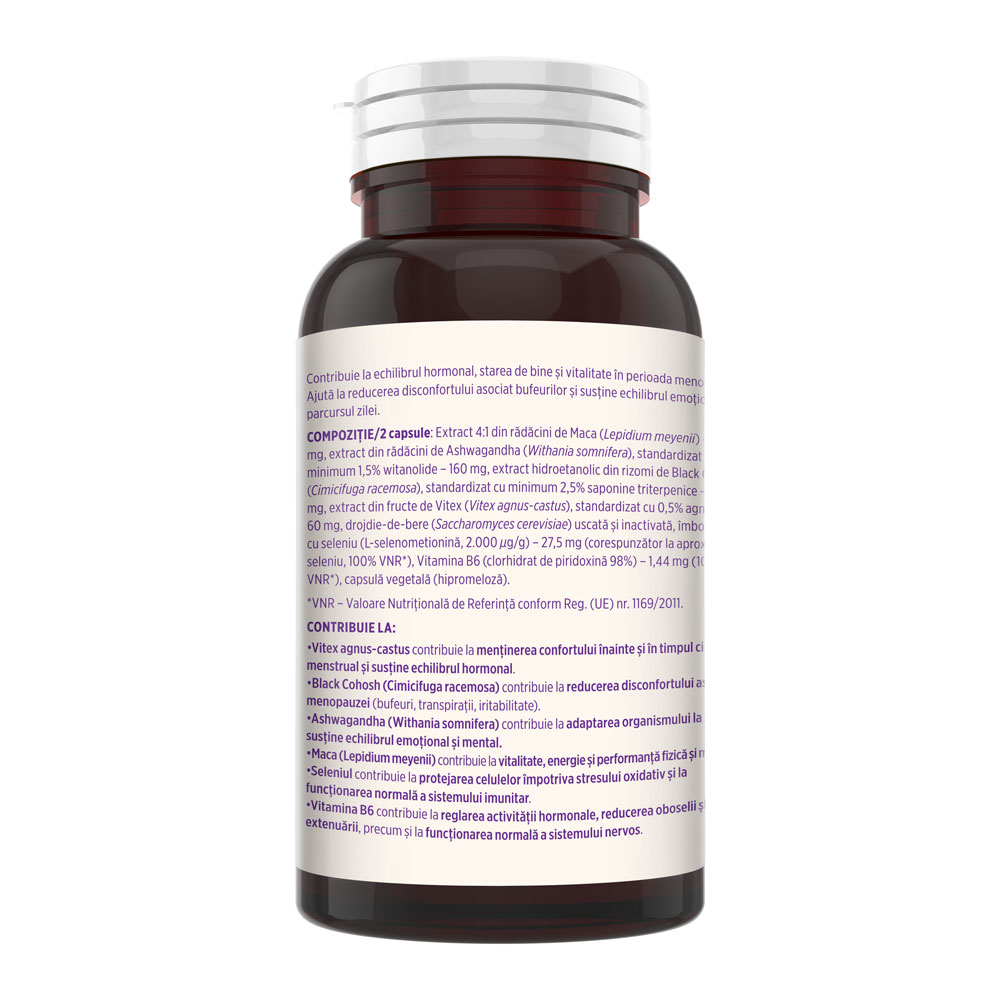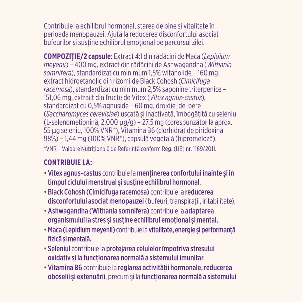 Ingrediente:Per 2 capsule: Extract 4:1 din radacini de Maca (Lepidium meyenii) - 400 mg, extract din radacini de Ashwagandha (Withania somnifera), standardizat cu minimum 1,5% witanolide - 160 mg, extract hidroetanolic din rizomi de Black Cohosh (Cimicifuga racemosa), standardizat cu minimum 2,5% saponine triterpenice - 151,06 mg, extract din fructe de Vitex (Vitex agnus-castus), standardizat cu 0,5% agnuside - 60 mg, drojdie-de-bere (Saccharomyces cerevisiae) uscata si inactivata, imbogatita cu seleniu (L-selenometionina, 2.000 ug/g) - 27,5 mg (corespunzator la aprox. 55 ug seleniu, 100% VNR*), Vitamina B6 (clorhidrat de piridoxina 98%) - 1,44 mg (100% VNR*), capsula vegetala (hipromeloza).