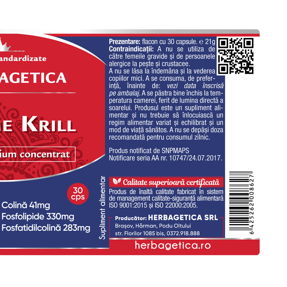 590 mg ulei de Krill (Euphausia superba; crustacee) purificat concentrat standardizat cu 15% EPA (acid eicosapentaenoic) 89 mg, cu 7% DHA (acid docosahexaenoic) 41 mg, cu 330 mg Fosfolipide (din care 283 mg Fosfatidilcolina si 41 mg Colina) si cu 50 mcg Astaxantina; capsula: gelatina din peste.