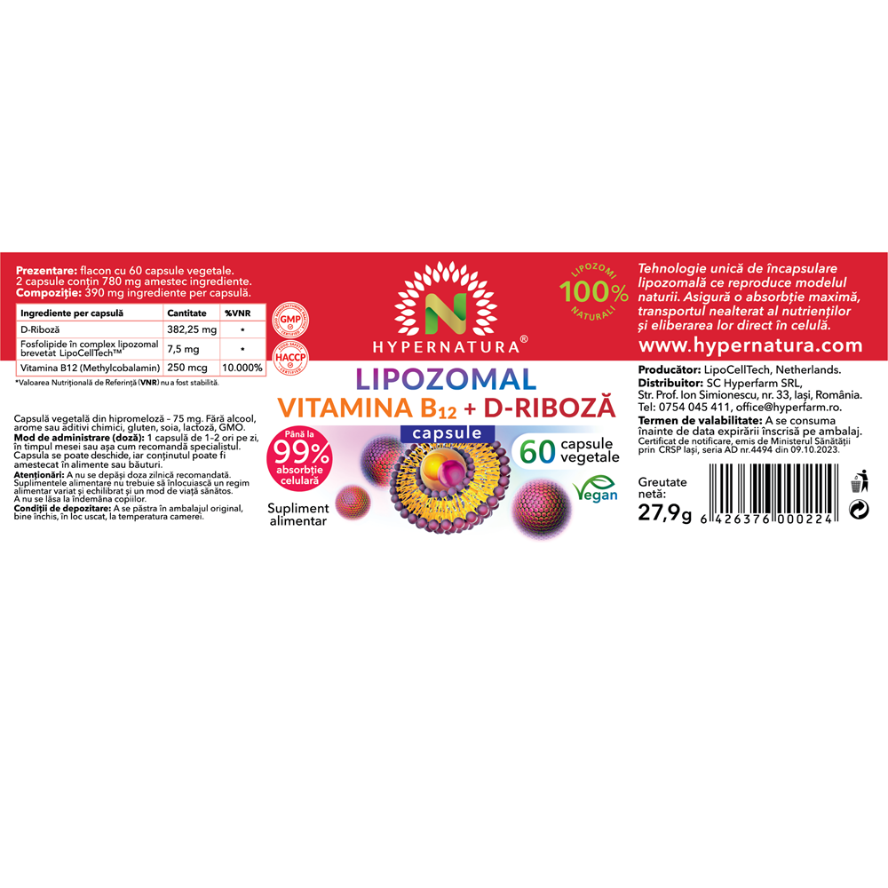 - supliment alimentar care contine 382,25 mg D-Riboza si 250 mcg Vitamina B12;