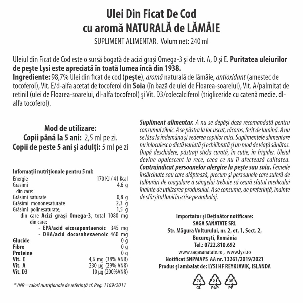 98,7% ulei din ficat de cod (peste), aroma naturala de lamaie, antioxidant (amestec de tocoferol), vit. E / d-alfa acetat de tocoferol din soia (in baza de ulei de floarea-soarelui), vit. A / palmitat de retinil (ulei de floarea-soarelui, dl-alfa tocoferol) si vit. D3 / colecalciferol (trigliceride cu catena medie, dl-alfa tocoferol).