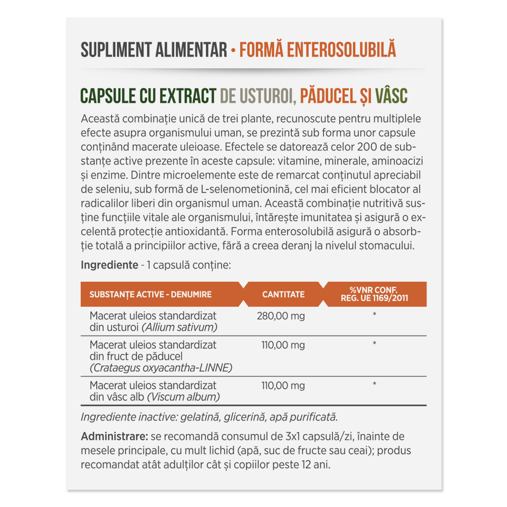 Ingrediente:Macerat uleios de usturoi 1:1, macerat uleios din fruct de păducel 1:1, macerat uleios din vâsc alb 1:2 ( 200 de substanțe active – vitamine, minerale, aminoacizi, enzime, seleniu, microelemente).